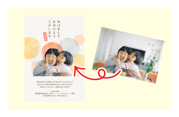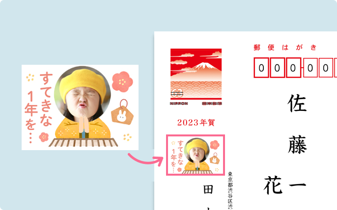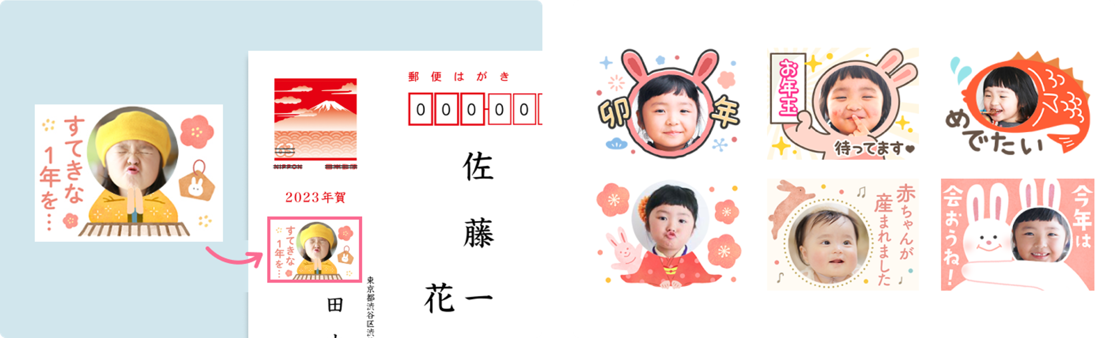 年賀状の宛名面に写真をプリントできる新機能です。家族やお子様の写真などを使って、オリジナルの年賀はがきを作れます。