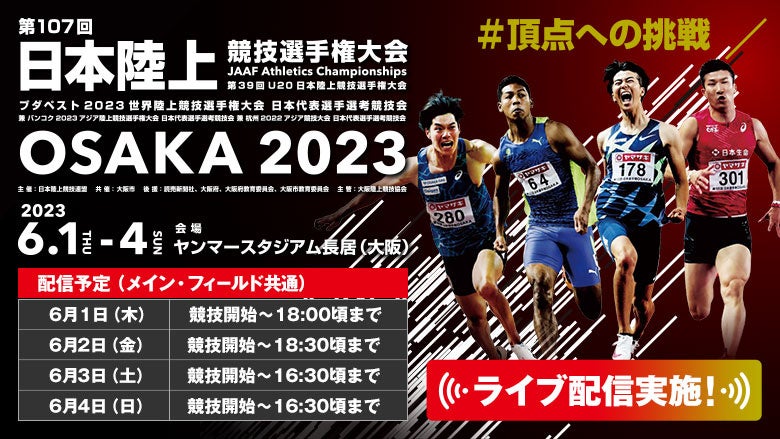 2023年6月1日(木)~4日(日)の4日間、ヤンマースタジアム長居(大阪)で開催する「第107回日本陸上競技選手権大会」をライブ配信いたします!