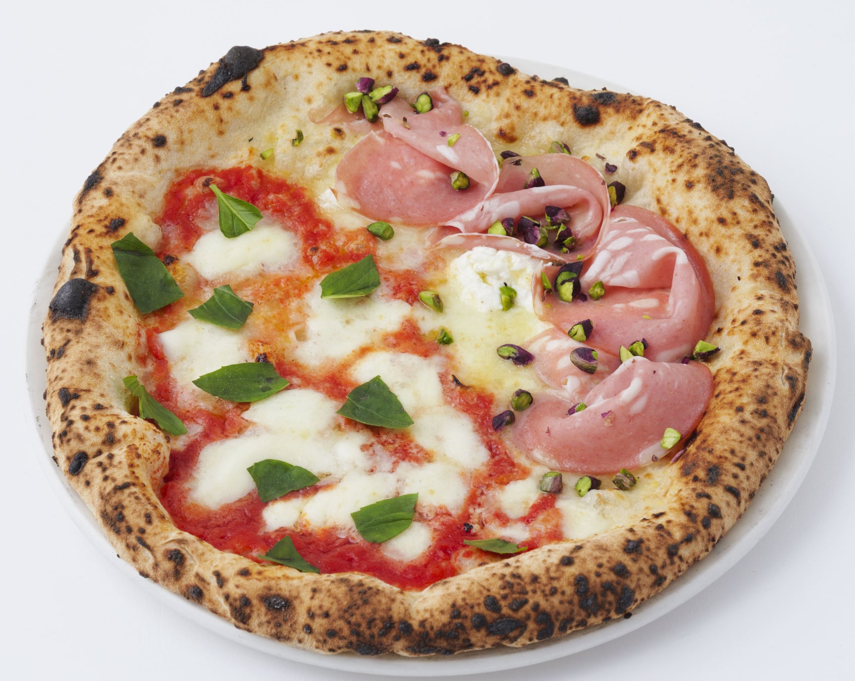 ジューシーな水牛モッツァレラチーズを使ったマルゲリータと、イタリアの定番の味・モルタデッラハムとリコッタチーズのピッツァの2種をハーフ&ハーフで。薪窯で焼いた香ばしい味わいがたまりません。