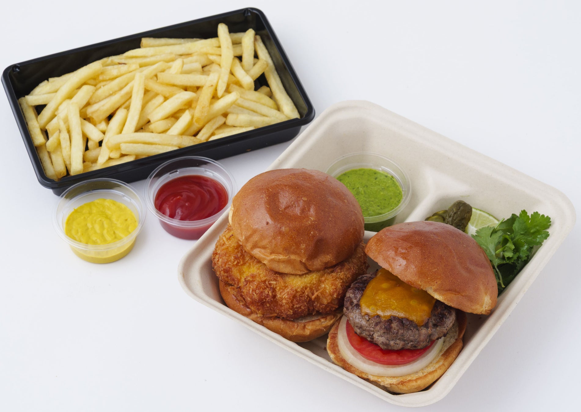 ショップの人気メニュー希少な短角牛のチーズバーガーとフライドシュリンプバーガーに、たっぷりのフレンチフライを合わせた豪華なピクニック限定セット。パクチー&ナッツの贅沢ソースが味わいに彩りを添えます。