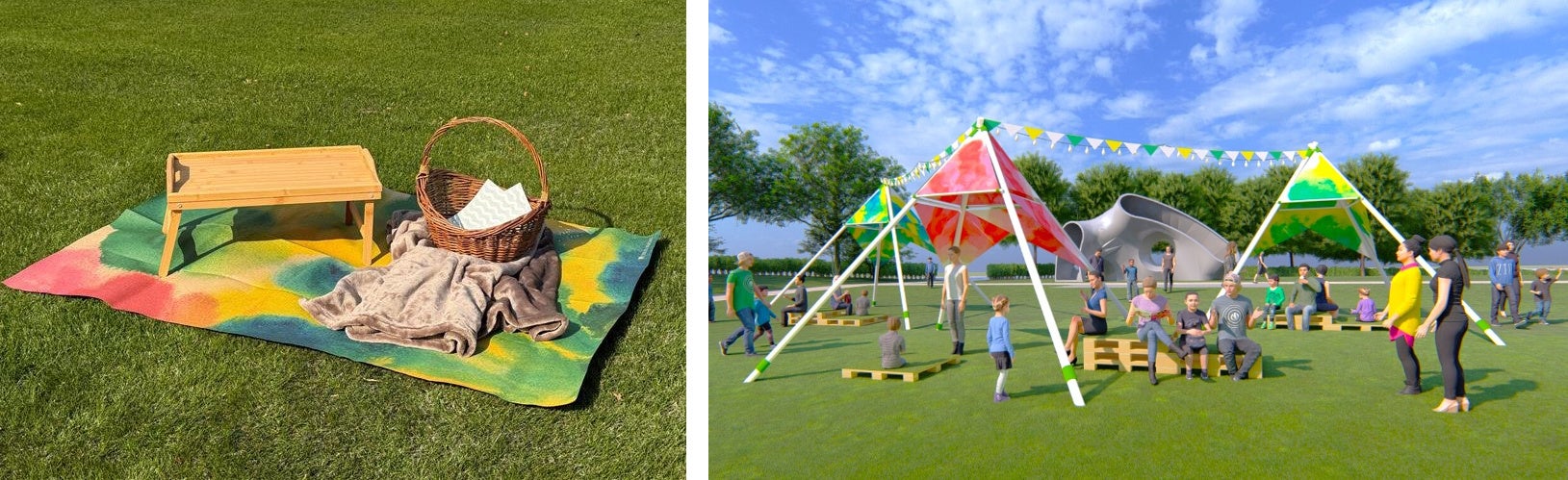 オリジナル保冷バッグやオリジナルピクニックシートのクリエイティブデザインは、イベントキービジュアルを担当した浜田智子氏が監修。芝生広場には、5月24日(金)まで浜田氏が手掛けたクリエイティブをあしらったテントオブジェを設置し、クリエイティビティを感じるくつろぎ空間を演出します。