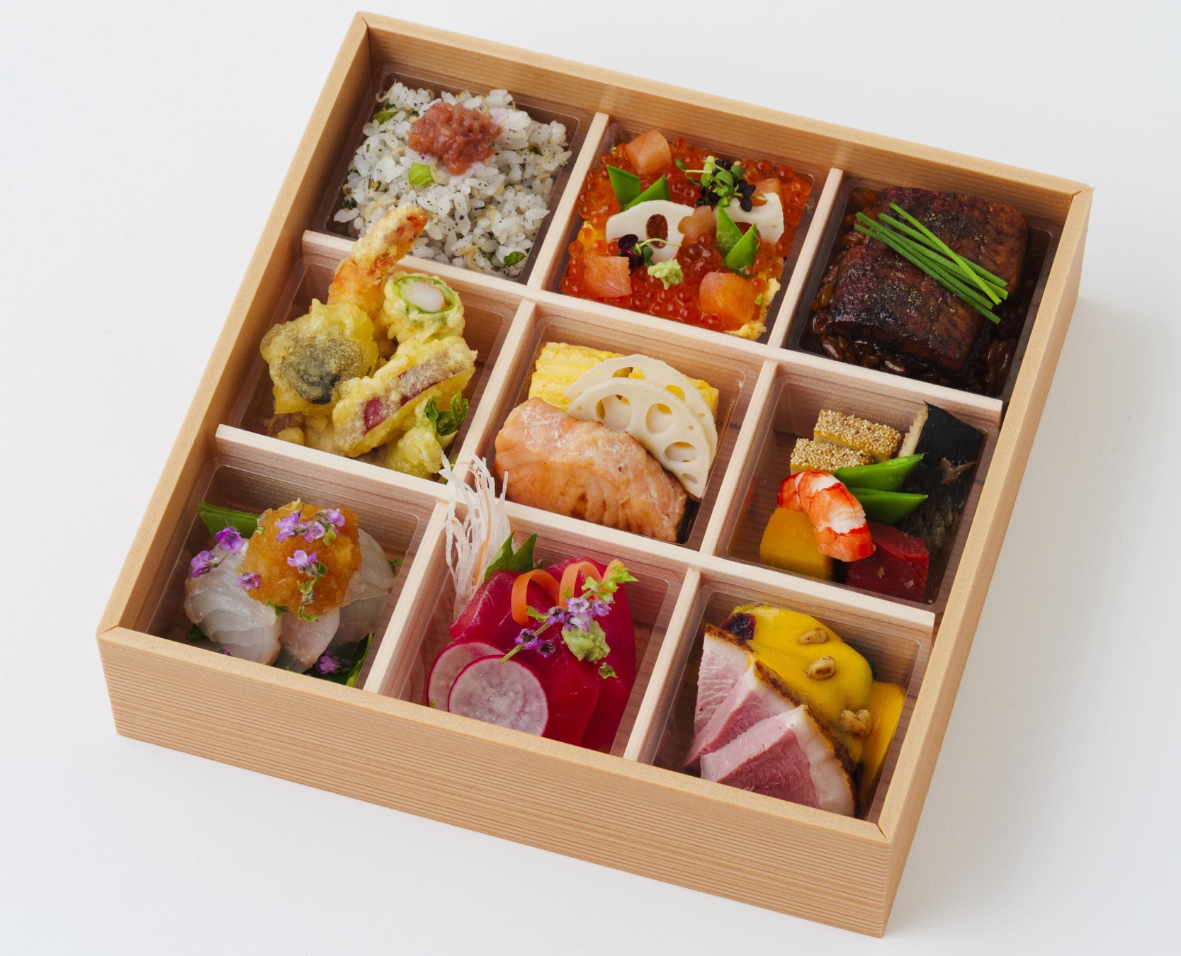 四季折々の食材に、繊細な技が加えられた〈宮川町 水簾〉の人気メニューから選りすぐりの9種を京風のお弁当に仕立てました。テイクアウトでもお店の味をそのままにお楽しみいただけます。