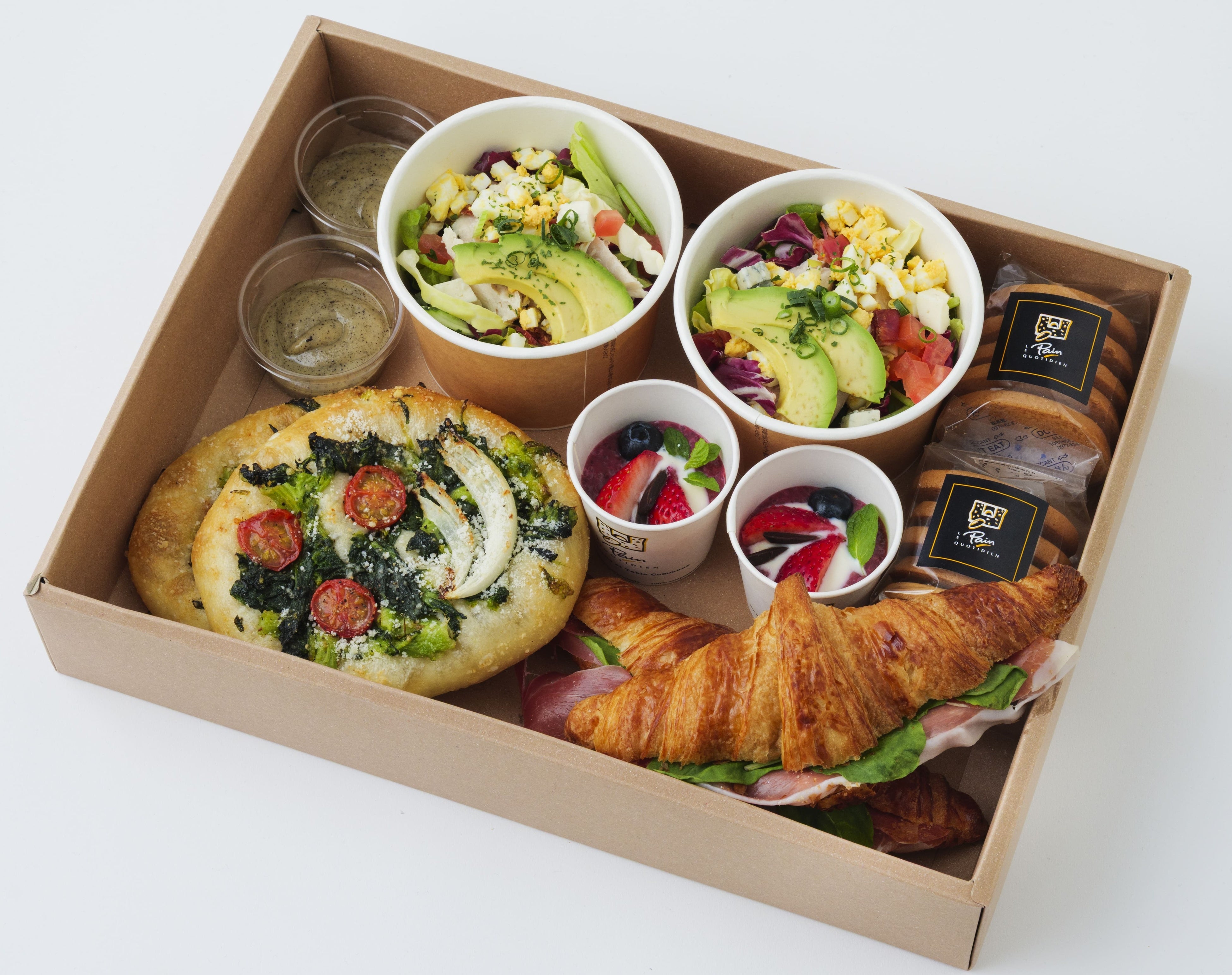 新商品のフォカッチャをはじめ、定番人気を誇るチキンコブサラダ、チアシードを効かせたチアプリンなどを詰め合わせました。〈ル・パン・コティディアン〉らしさあふれる華やかなピクニックボックスを、緑の中で楽しんで。