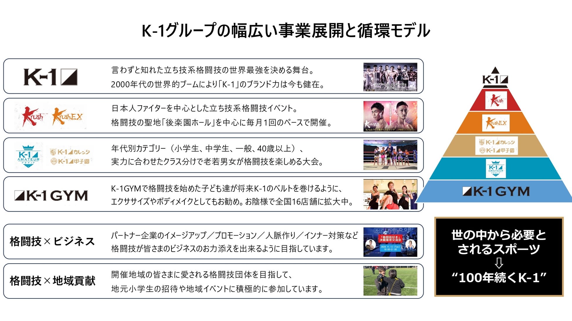 株式会社M-1スポーツメディアは、格闘技イベント「K-1」の運営及びプロモーション活動を展開しております。2023年より掲げた「K-1 ReBIRTH」というコンセプトのもと、再び世界最強の立ち技格闘技の復興を宣言。世界ライセンスを保有・管理し、選手育成や興行開催を通じて、K-1を「人類共有の格闘技」として発展させることを目指しています。