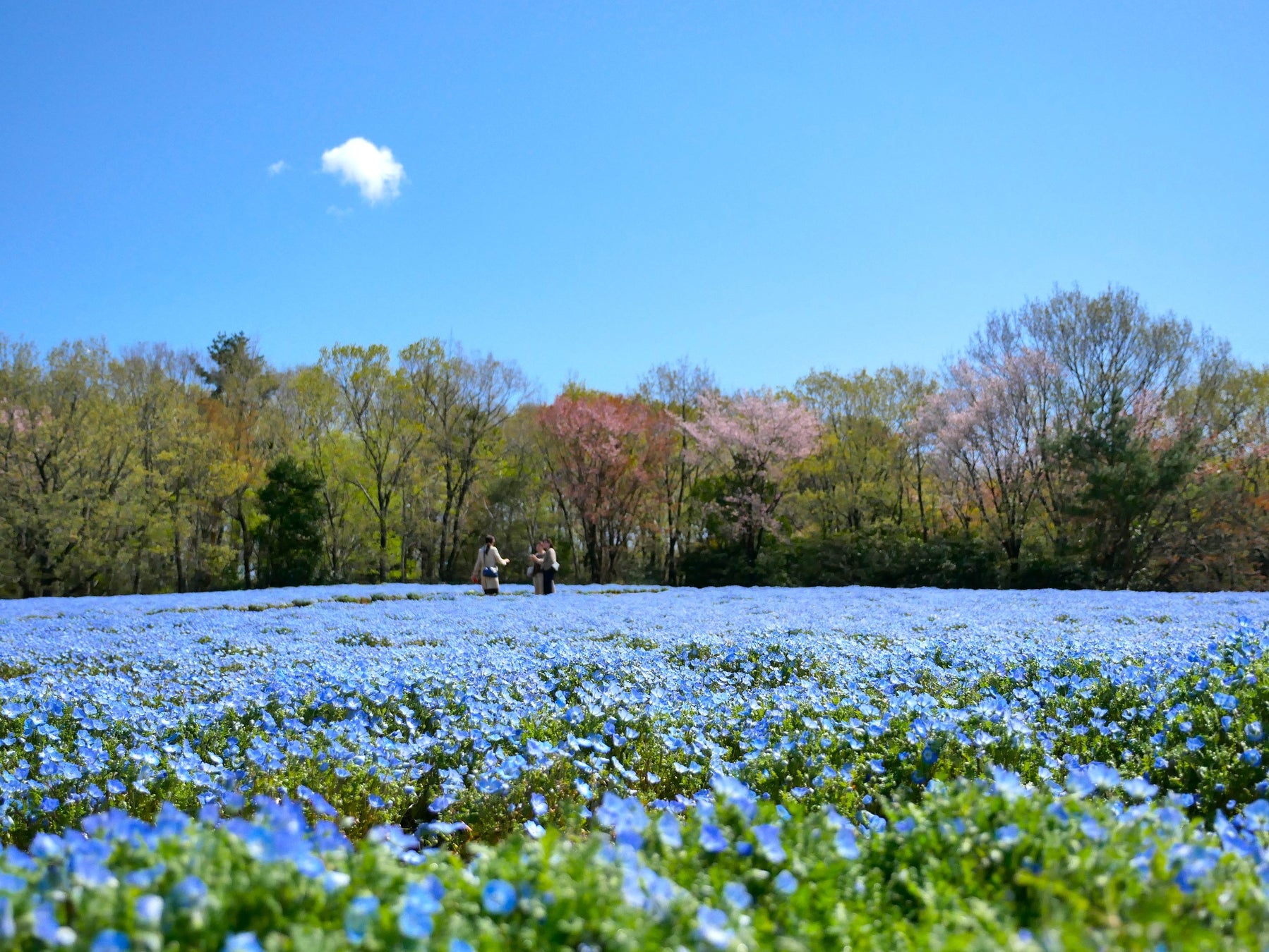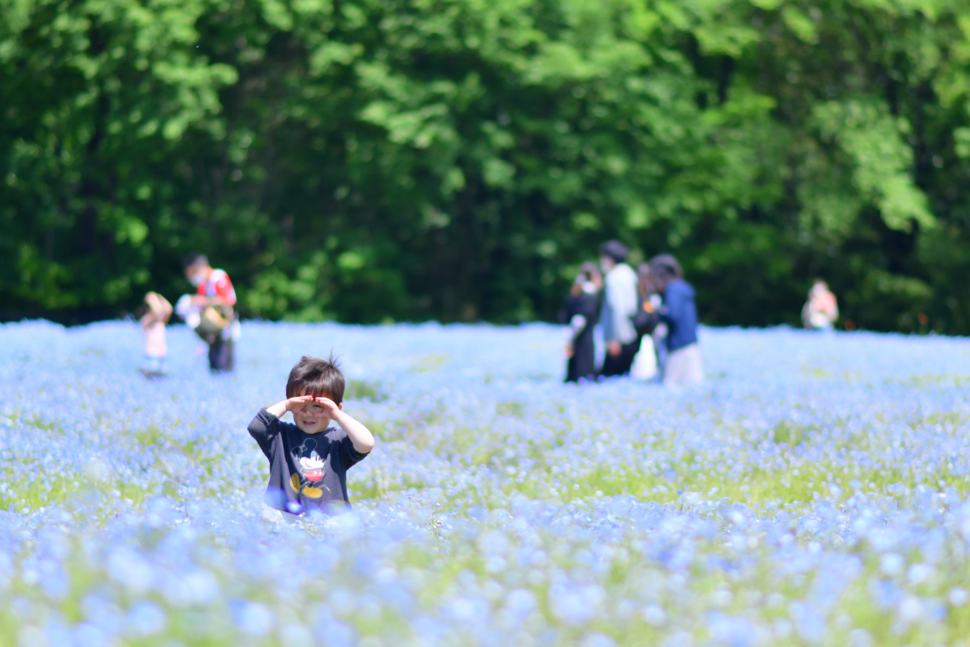 西口ひろば花畑の斜面に広がるネモフィラ。広い青空と新緑、柔らかな空色のネモフィラとのコントラストをお楽しみください。花畑をよく観察すると、白いネモフィラも見つけることができます。西口から徒歩約5分とアクセス抜群のため、時間が限られた中でのご来園にもオススメです。