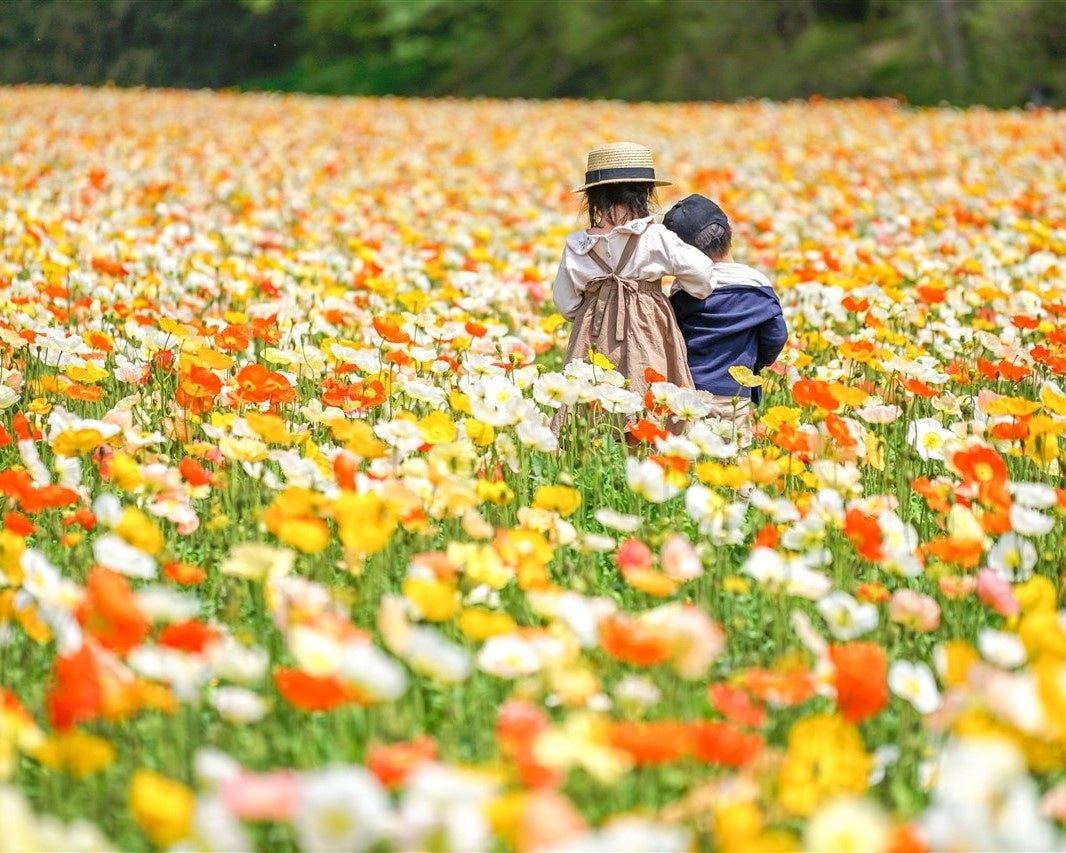 南口・中央口から約20分の場所にある「運動広場花畑」では、約70万本のアイスランドポピーが咲き誇ります。広さは約8,000㎡。新緑と青空を背景に、ビタミンカラーが映える絶景をお楽しみください。5月下旬頃からは花畑の1/3の面積で赤い「シャーレーポピー」をお楽しみいただけます。