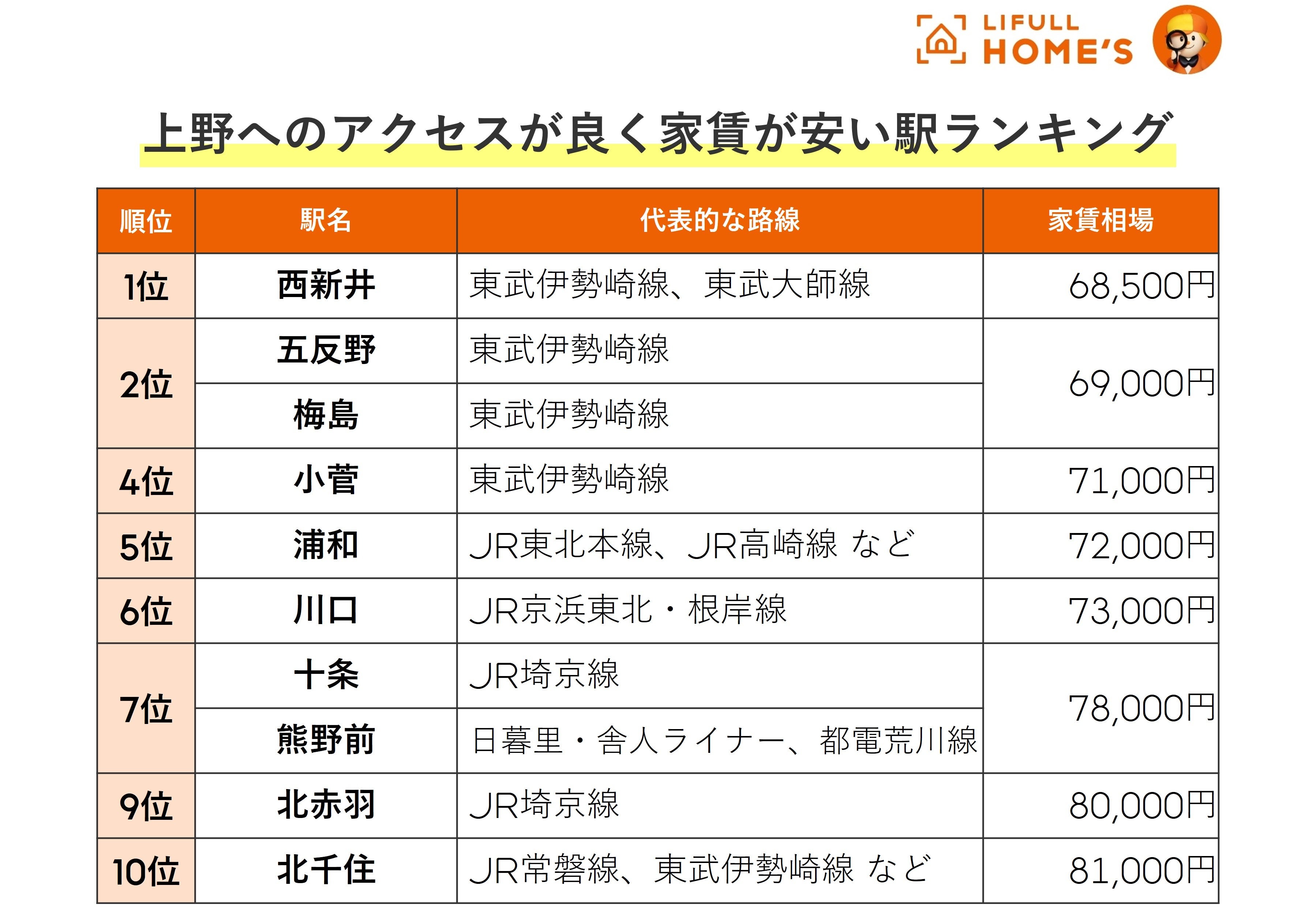 今回ランキングに入った駅は、「北の玄関口」上野駅へのアクセスはもちろん、池袋や新宿、浅草、日暮里といったターミナルのほか、銀座、六本木、九段下など都心へ直通する電車も発着することから都内への通勤通学の利便性にも優れており、東京で初めて生活をする学生や、仕事でさまざまな地域への出張が多いといった人々の需要に応えるエリアといえます。この地域に住むことで便利になりそうな方は、今回のランキングを参考に住まい探しを検討してみてもよいかもしれません。