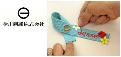 推し色のネームタグ・希望の文字・刺繍糸を選んで刺繍ミシンのスタートボタンを押します。ご希望の方は有料のワッペンを貼り付け可。