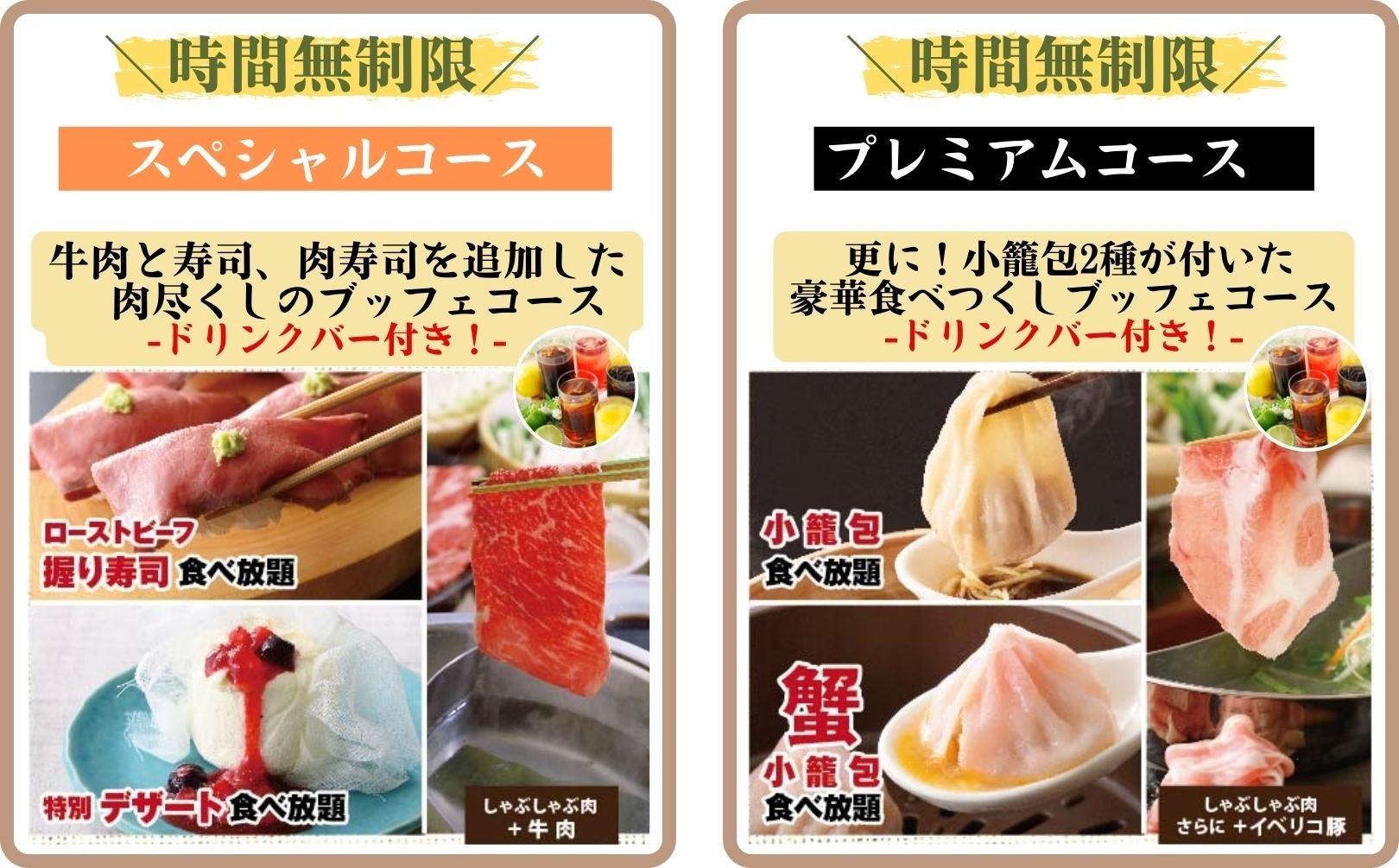 上位のコースでは、肉の旨みがギュッとつまった『肉寿司』や『牛しゃぶ』、蒸したて熱々の肉汁たっぷりの『小籠包2種』なども食べ放題!