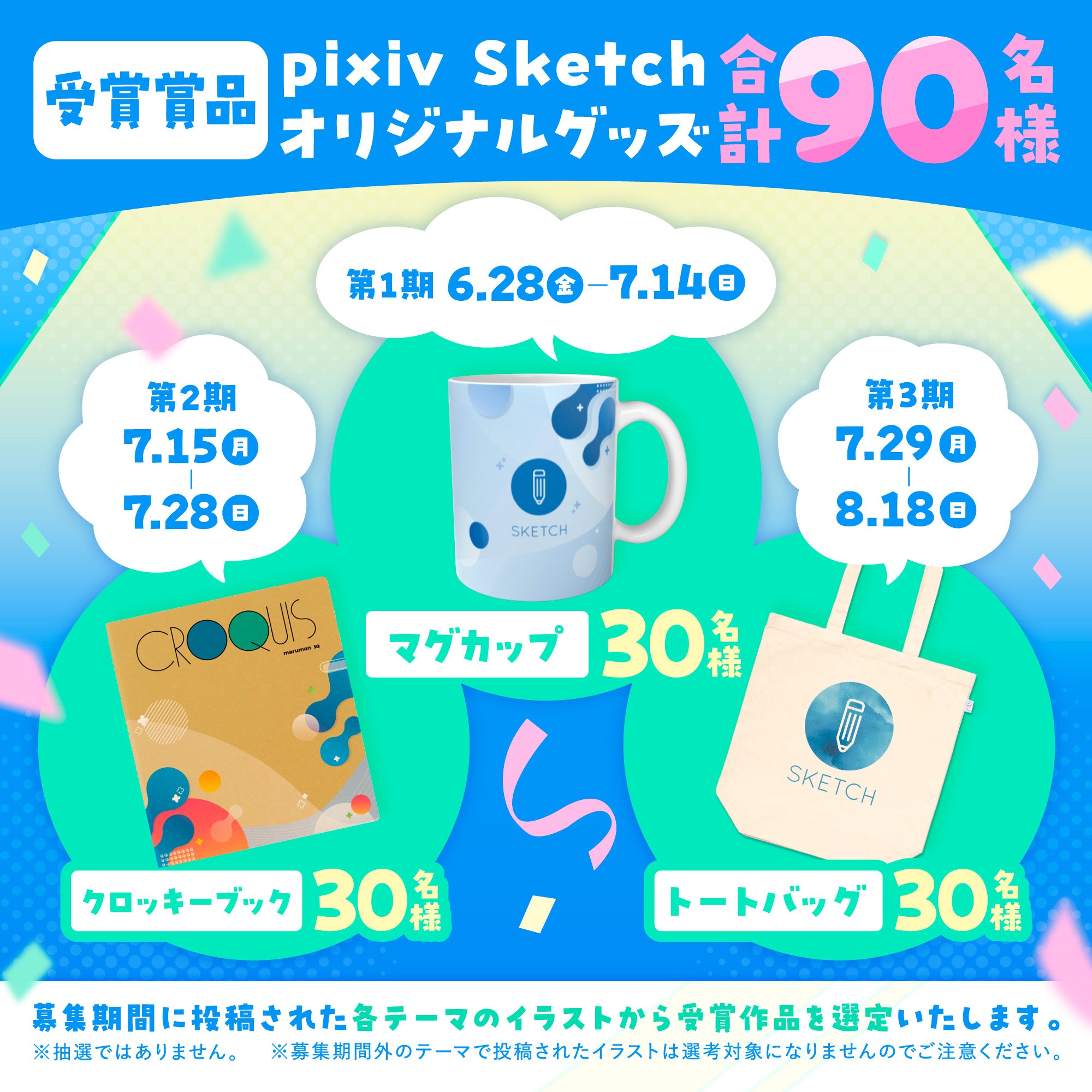本企画では、3期に分けてそれぞれ異なるテーマでイラストを募集します。各期間でテーマに沿ったイラストを投稿された方の中から合計90名様にpixiv Sketchオリジナルグッズをプレゼントいたします。ぜひふるってご参加ください。