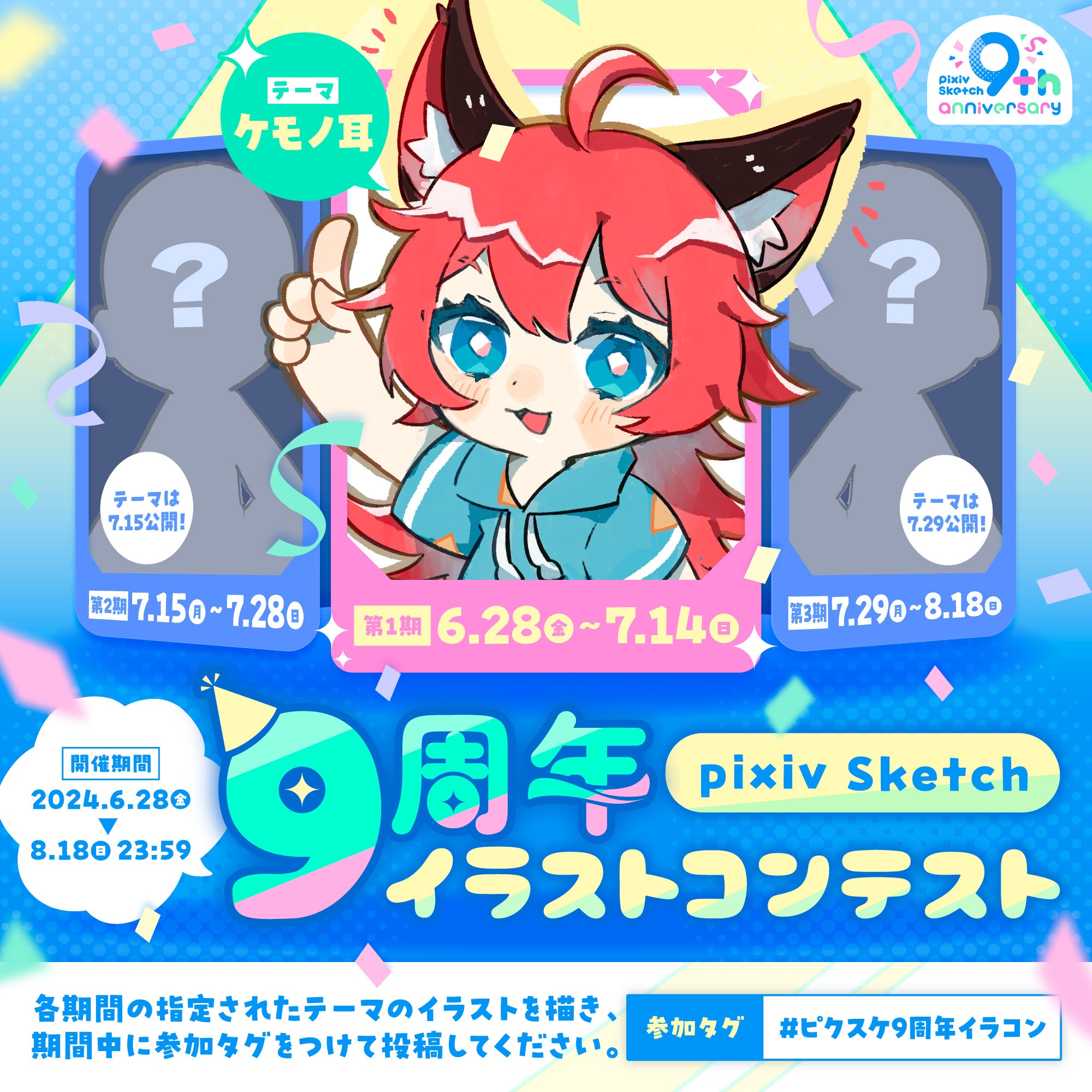 各期間に指定されたテーマに沿ったイラストを描き、参加タグ「#ピクスケ9周年イラコン」をつけて、pixiv Sketchに投稿してください。