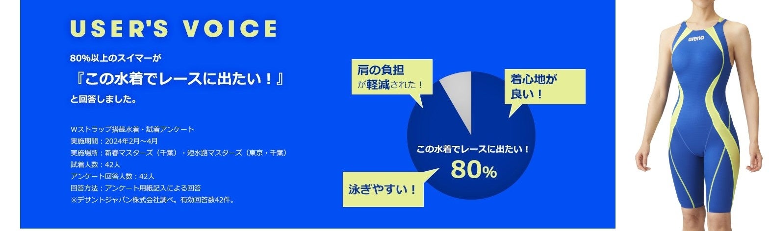 デサントジャパン株式会社が展開する、スイミングをコアとする『アリーナ』ブランドは、女性スイマーが水着着用時に“肩に感じる負担”を軽減する機能「ダブルストラップ」を開発しました。肩紐を2本にすることで1点にかかる圧を2点に分散させる「アリーナダブルストラップ理論」に基づいたもので、世界で戦うトップスイマー向けの競泳水着にも活用している機能です。2024年2月~4月に実施した「ダブルストラップ」搭載水着の試着会アンケート(*)においては「この水着でレースに出たい」など、約80%の回答者から好評価を得られました。