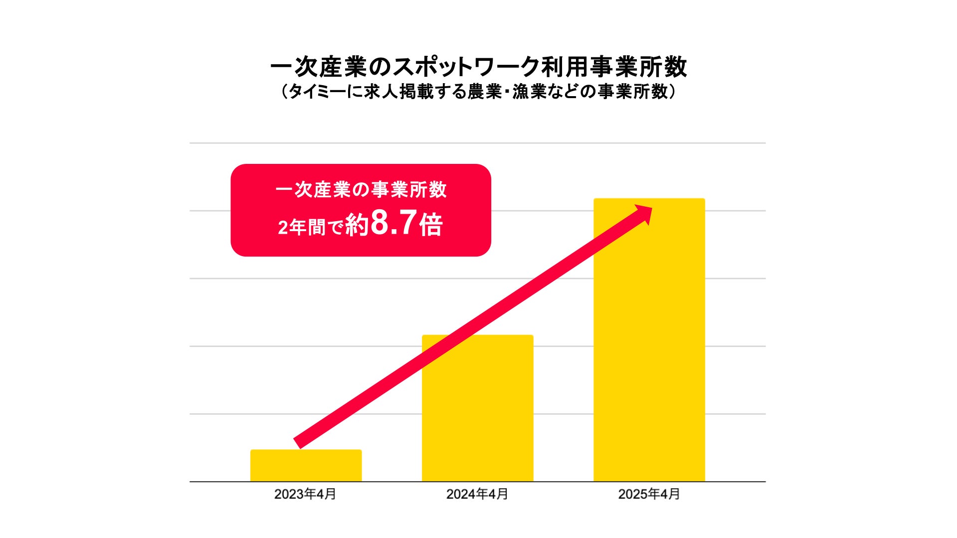 これらの取り組みを通じて、タイミーに求人を掲載する一次産業(農業・漁業など)の事業所数は、2023年4月から2025年4月の2年間で約8.7倍に増加。事業所数の増加によって求人の募集人数も同期間で約5倍に広がりを見せ、特に人手が不足する農業の農繁期に合わせて募集人数が増えています。