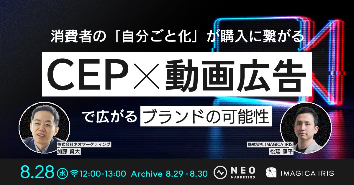 映像の企画から制作、映像編集、配信・流通向けサービスに至るまでを、グローバルにワンストップでお届けする株式会社IMAGICA GROUPのグループ会社で、クリエイティブに特化したデジタル広告代理店であり、WEB動画をはじめとしたコンテンツ制作からマーケティング、プロモーションまでを総合的に提案する株式会社IMAGICA IRIS(本社:東京都渋谷区、代表取締役社長:根本敦史)は、株式会社ネオマーケティング(本社:東京都渋谷区、代表取締役:橋本光伸)と共催で、8月28日(水)12時より、オンラインセミナー「消費者の「自分ごと化」が購入に繋がる CEP×動画広告で広がるブランドの可能性」を開催いたします。