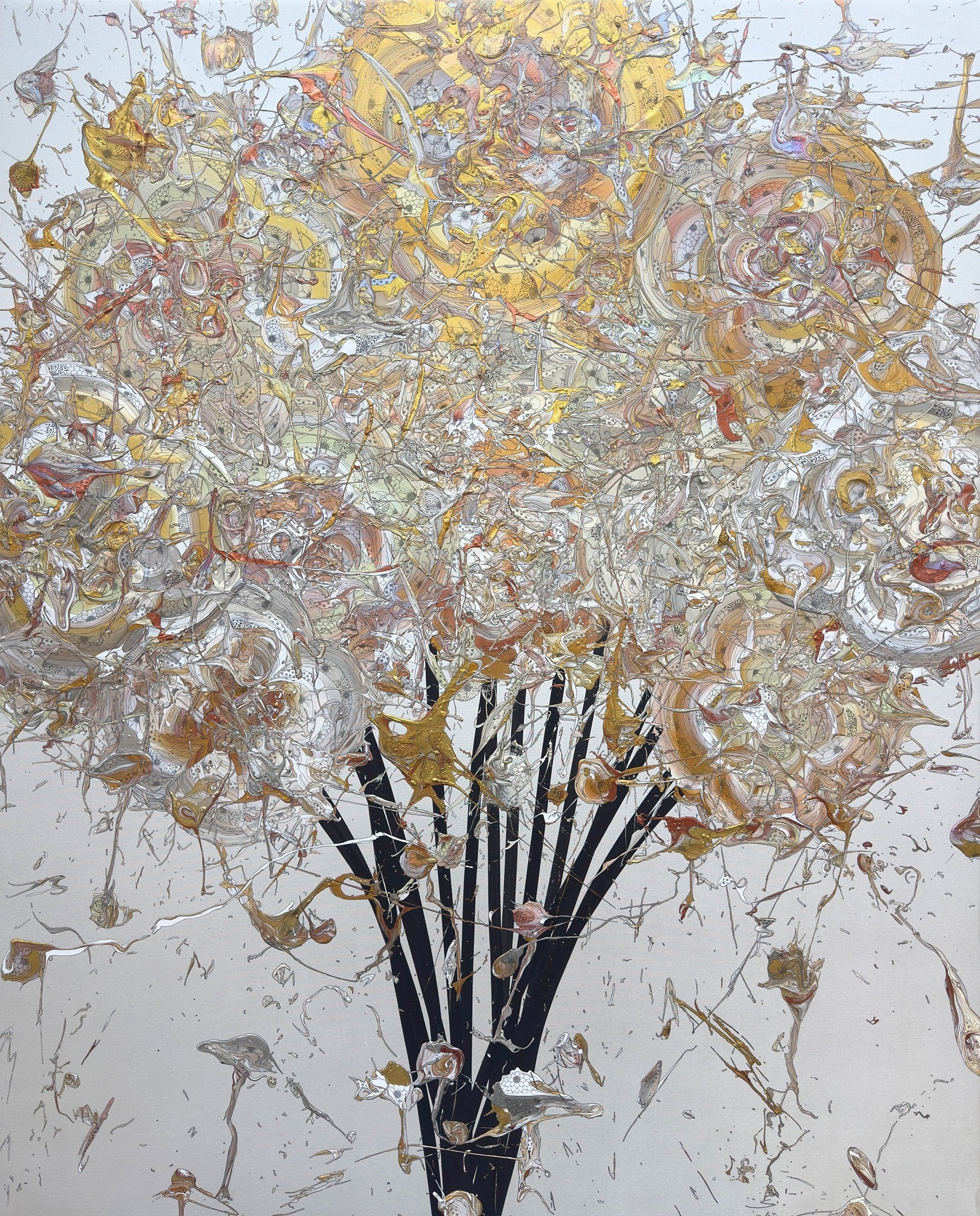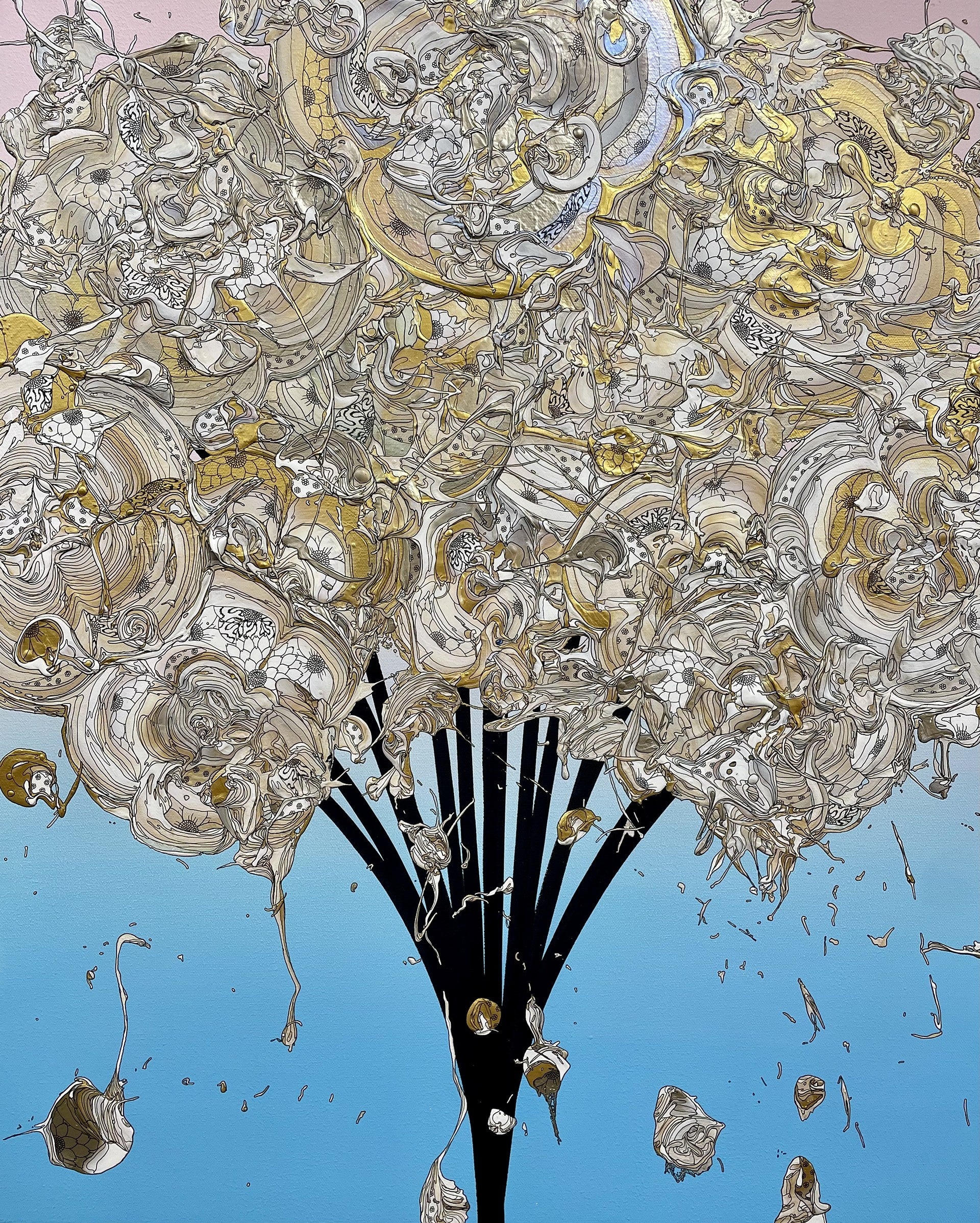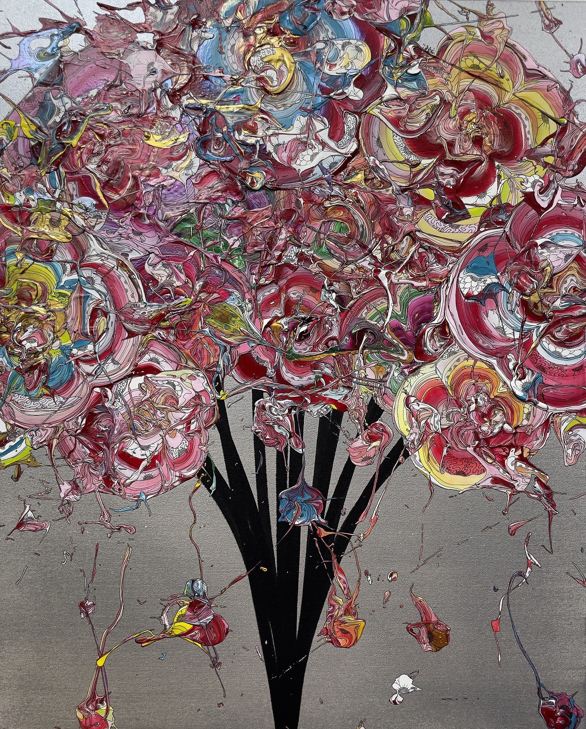 奥田雄太は1987年愛知県生まれ。日本とイギリスでファッションデザインを学んだのちデザイナーとして活動し、2016年にアーティストへ転向。以降、国内外での個展・グループ展へ精力的に参加し、制作と発表を重ねてきました。近年は、絵具の流動や重なりといった「偶然性」を取り入れた花のシリーズを中心に制作。力強いストロークによる絵具の動きと、ペンによる繊細な線描が同一画面で構成される表現は、奥田作品の大きな魅力となっています。