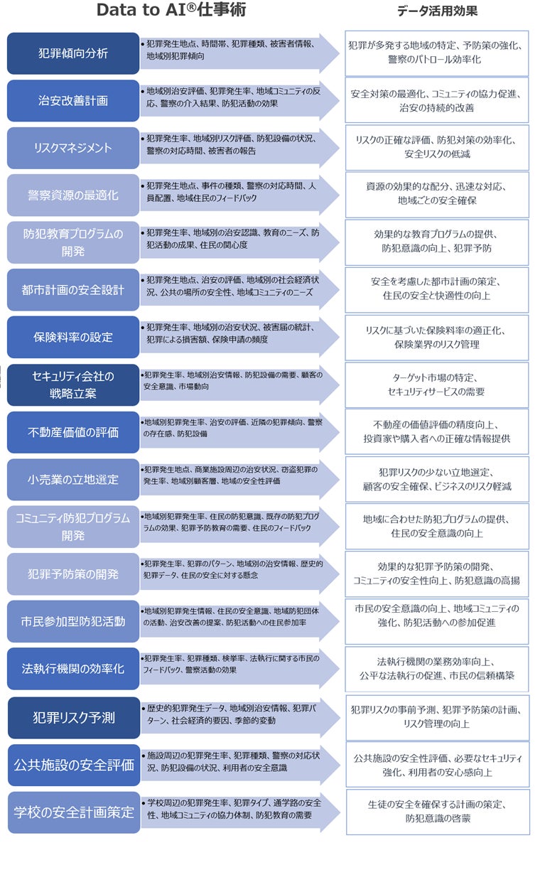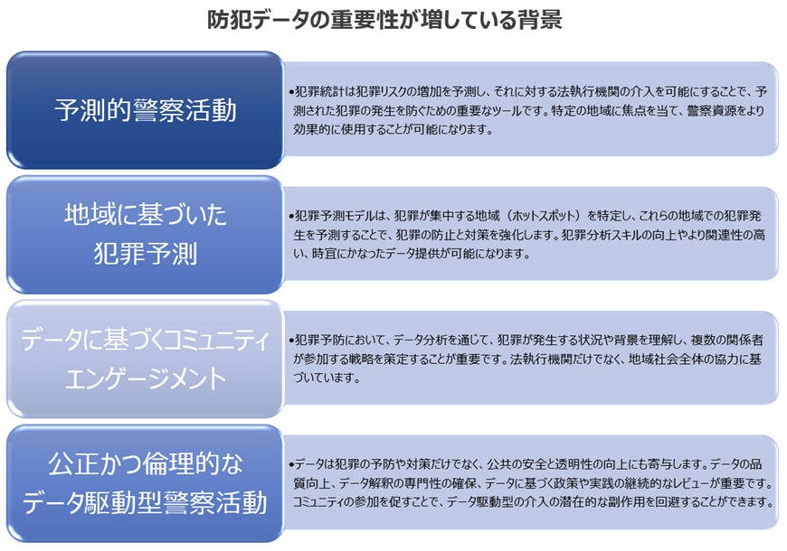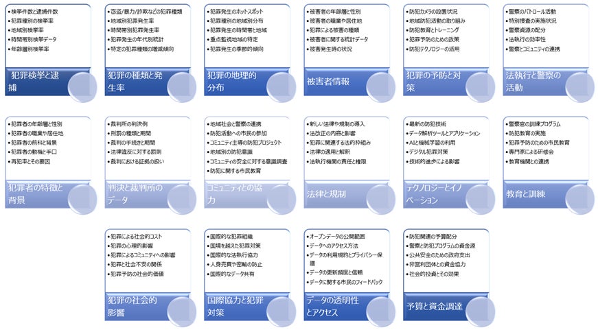 これらの分野は、防犯オープンデータの範囲と多様性を示しており、犯罪の予防と対策において重要な役割を果たしています。