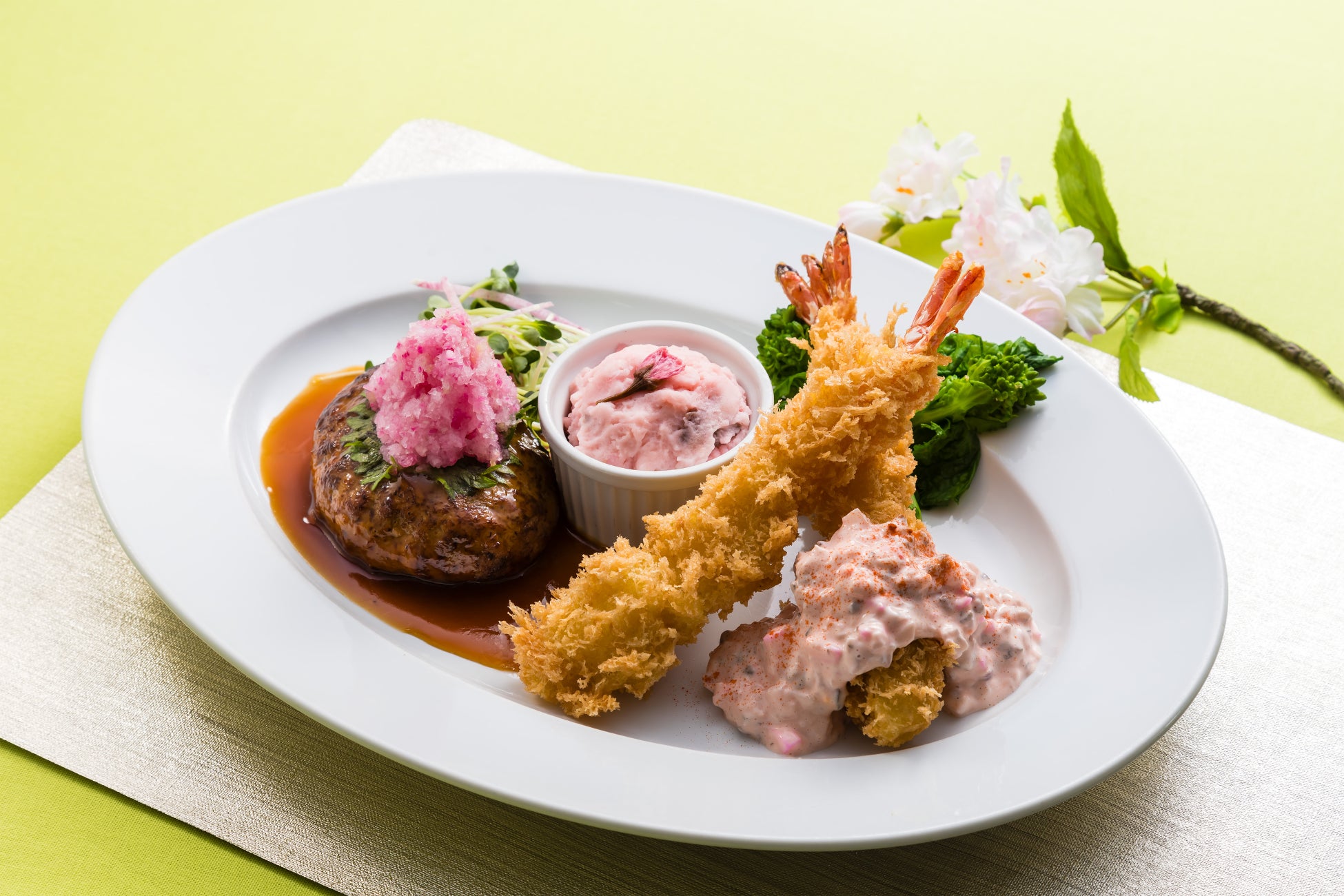内容:当店人気の和風コンビプレートを桜色にアレンジ。ハンバーグには紅芯大根のおろし、エビフライにはしば漬け入りタルタルソースを合わせ、桜風味のポテトサラダを添えた春らしい一品。