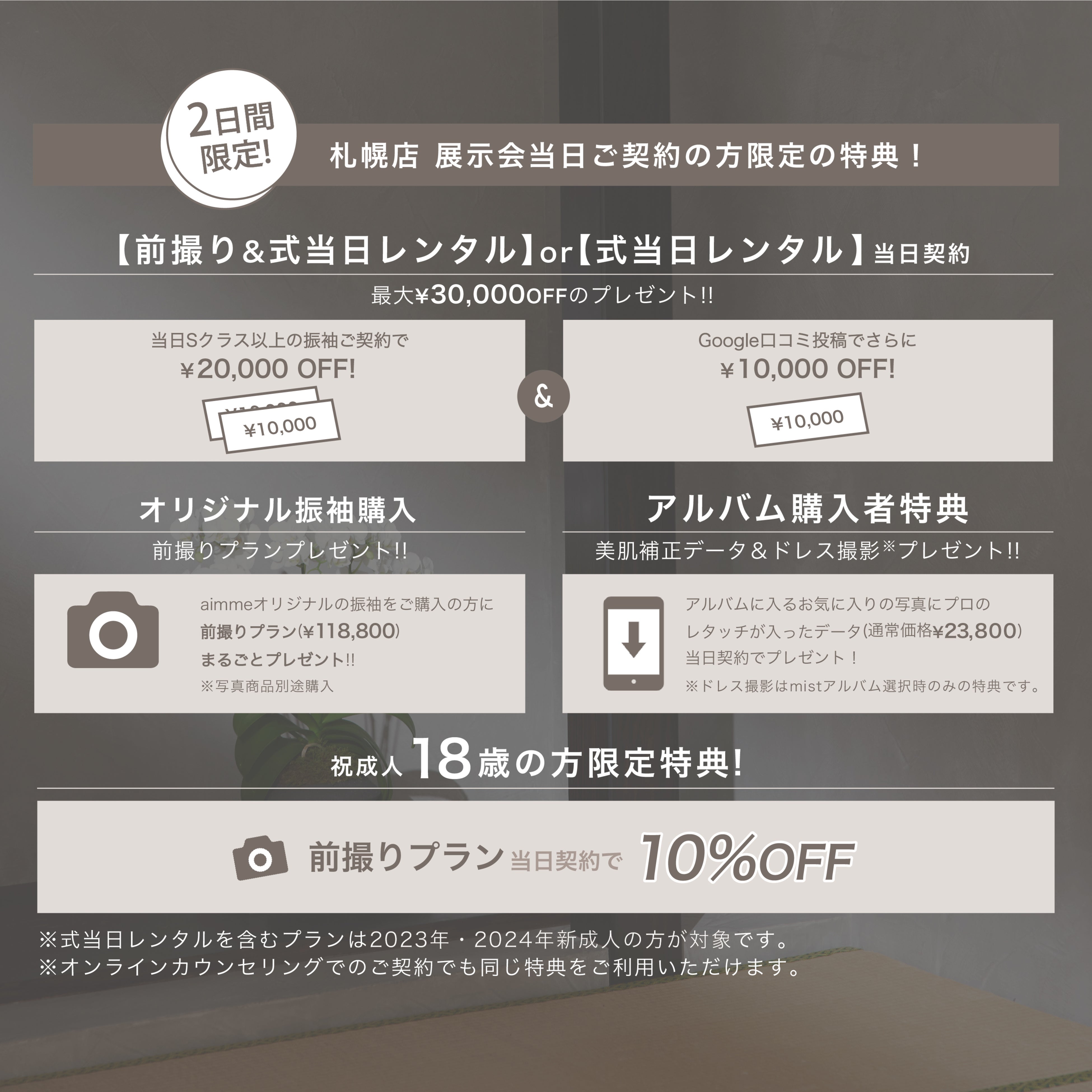 10代から20代女子の支持率NO1フォトスタジオのaimme(エイミー)が、毎年大好評の振袖展示会を東京、札幌の2都市で開催。