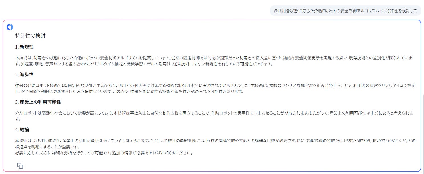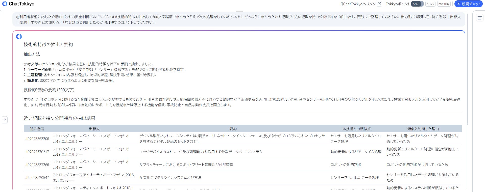 「MyTokkyo.Ai」は、研究メモやログデータ、試験レポートなどを解析し、AIが発明の本質を抽出する機能を有する。本件では、加速度・筋電・音声センサから得た時系列データを入力し、AIが「状態推定モデル」「安全閾値更新機構」「緊急停止条件」の3つの要素を自動特定。先行特許との差分(閾値の個人適応更新処理)を明確化し、発明提案書から出願ドラフトまでの工程を大幅に短縮した。