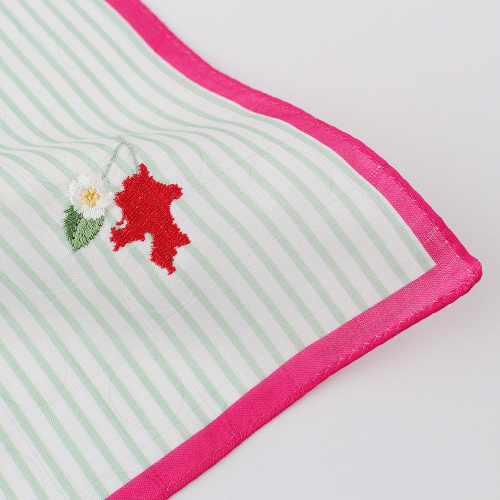 いちごに見立てた福岡県の地形を刺繍で表現。いちごの横に小さく咲き誇る、繊細ないちごの花の刺繍もポイントです。福岡在住、出身の方、福岡やいちごが好きな方にもおすすめのハンカチーフです。店頭ではイニシャル刺繍(別途440円~)をお入れして、特別な一枚をお作りいただけます。ご当地愛溢れるギフトを贈ってみてはいかがでしょうか。