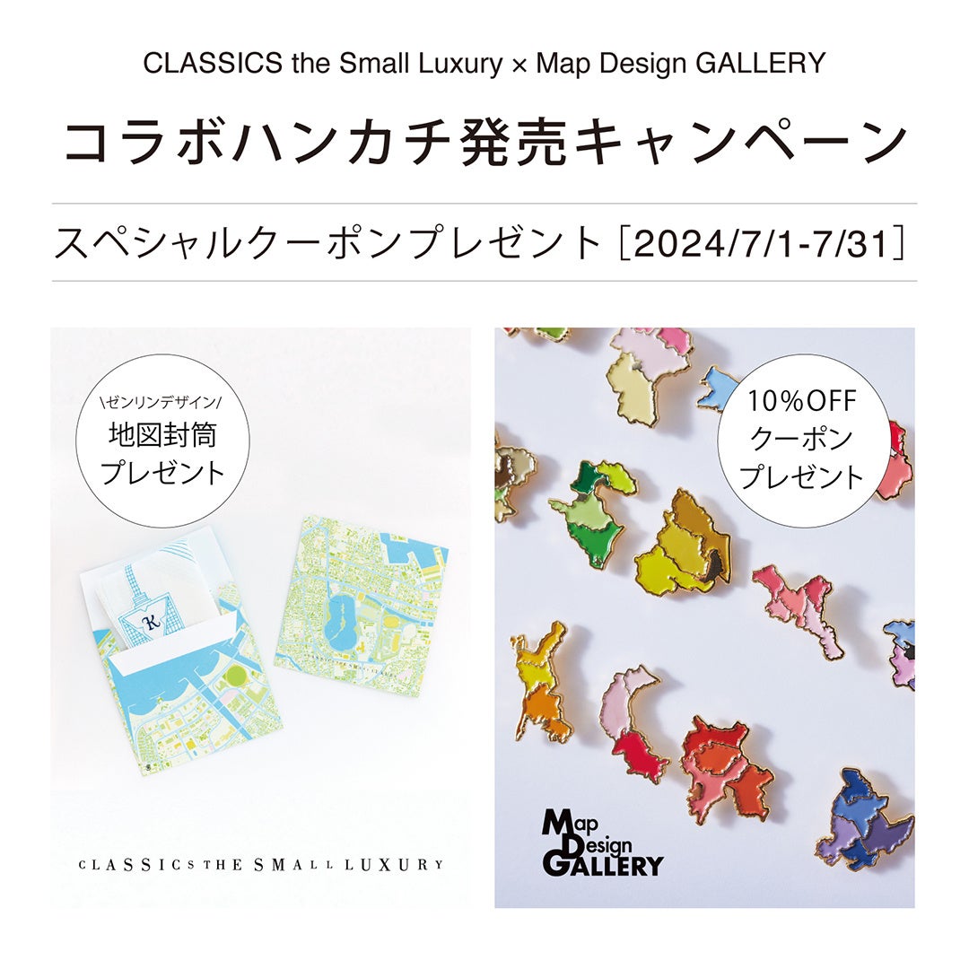 コラボハンカチ発売を記念して、クラシクス・ザ・スモールラグジュアリ公式InstagramとMap Design GALLERYの公式Instagramをフォロー&いいねで、コラボハンカチ&地図柄封筒を、抽選で10名様にプレゼントします。