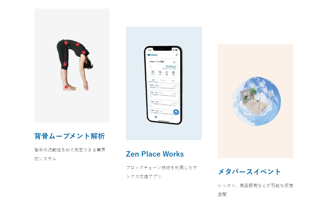 最先端研究結果・科学をもとに、DX・Web3.0との融合を行い、日本国内だけでなく中国をはじめとする海外のピラティス・ヨガスタジオの運営や学びを深める養成コースやワークショップ、ウェルビーイングを促進する自社開発アプリやAI解析サービス、豊かな一生をサポートするヘルスケア・アプリの開発やクリニック・訪問看護、さらに免疫や内蔵機能の調節など様々な生体機能に効果があるといわれているCBDを取り扱うECサイト運営や自社開発など、ZEN PLACEらしいユニークでシームレスな事業展開でHolistic WellnessとWell-beingを実現し、社会に変化をもたらすユニークでオンリーワンの会社です。 ZEN PLACEと、もっとウェルビーイングな未来へ−