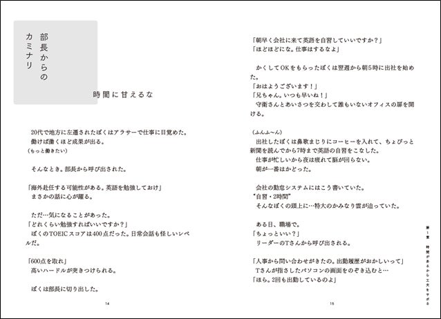 これまでに経験した「時間」「働き方」「人間関係」に関する失敗談やそこから得た気付きを、短いストーリー形式でSNSに投稿したところ、等身大のメッセージがユーザーの心を打ち、半年で累計3億回以上のインプレッションを獲得するなど話題となりました。本書はそのストーリーを1冊にまとめたもので、時にはほろっと泣けて、時にはクスッと笑いながら、「本当に自分が幸せになれる働き方」とは何かについて考えるきっかけをくれる自己啓発書となっています。