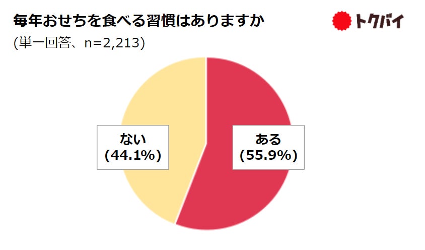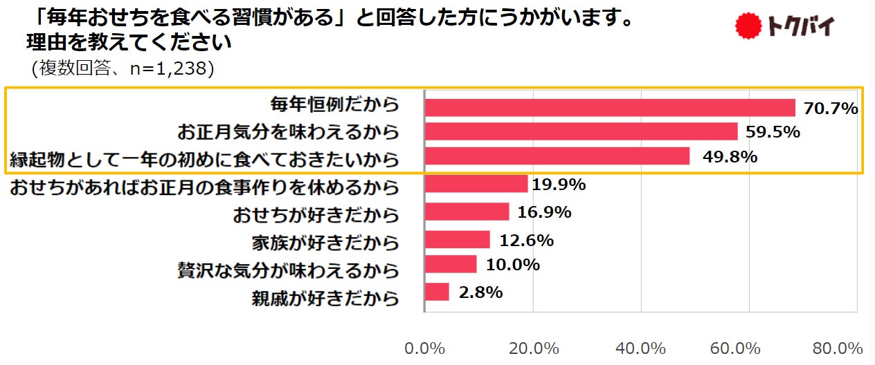 1. 2人に1人以上が「毎年おせちを食べる習慣がある」。食べる理由は「毎年恒例だから」70.7%、「お正月気分が味わえるから」59.5%、「縁起物として一年のはじまりに食べておきたいから」49.8%