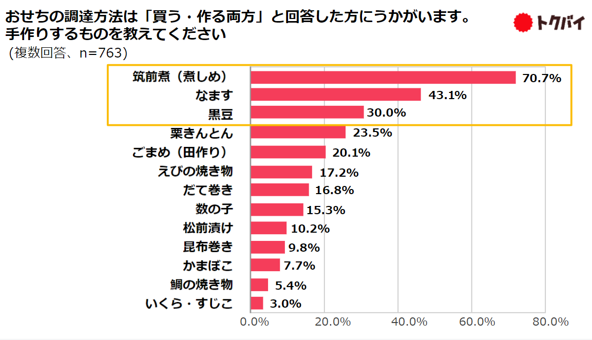 「ハイブリッド調達型(買う・作る両方)」の人に購入方法について聞いたところ、半数以上が「おせち料理を1品ごとに買う」と回答し、購入場所については「スーパーマーケット」が約8割でした。作るものは、「筑前煮(煮しめ)」70.7.%が最も多く、「なます」43.1%、「黒豆」30.0%が続きました。おせち料理ごとに手間や利便性を考慮し、調達方法を選択していることがうかがえます。