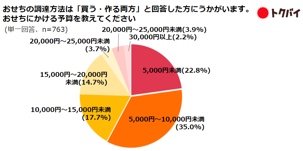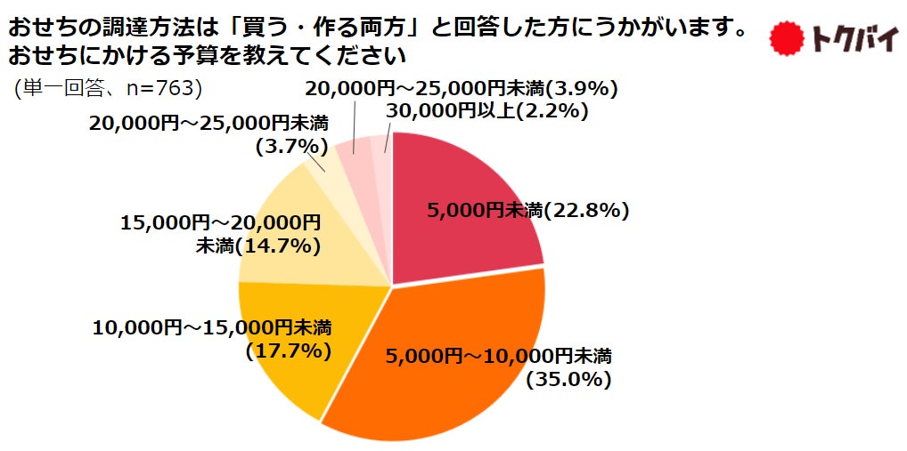 「ハイブリッド調達型(買う・作る両方)」の人におせち料理にかける金額をたずねたところ、「5,000~10,000円未満」の価格帯が35.0%で最多となりました。「5,000円未満」22.8%と合わせると「10,000円未満」が半数以上を占めました。