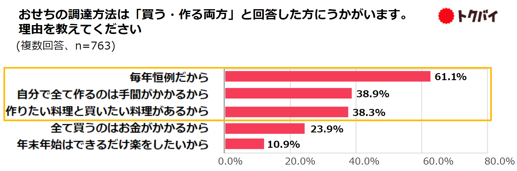 来年(2024年)おせちを食べる予定の人に調達方法をたずねたところ、「買う・作る」両方を活用する「ハイブリッド調達型」が6割以上にのぼりました。具体的な理由としては「毎年恒例だから」61.1%、「自分で全て作るのは手間がかかるから」38.9%、「作りたい料理と買いたい料理があるから」38.3%との声があがりました。家族の好みや生活スタイルに合わせて調達方法が多様化していることがうかがえます。