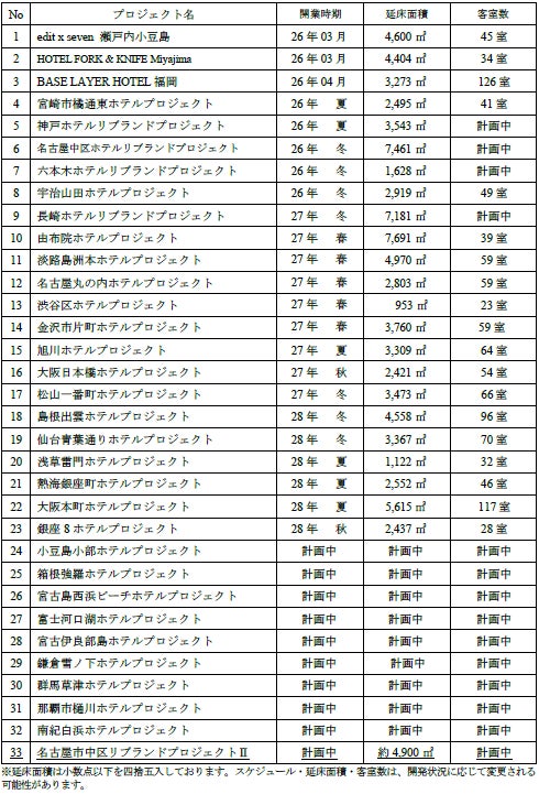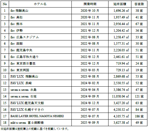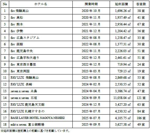 当社は、観光立国の実現や地域創生への貢献を目的にホテルの開発に取り組んでおり、多人数向けホテルブランド『fav』『FAV LUX』『edit x seven』『seven x seven』、およびカルチャービジネスホテル『BASE LAYER HOTEL』を全国で展開しております。