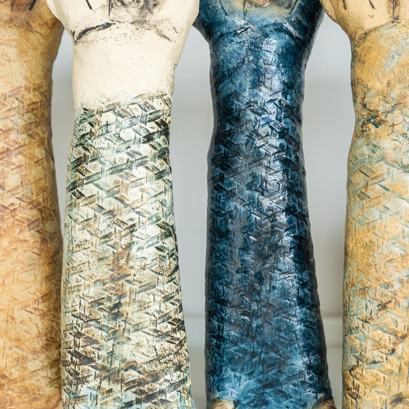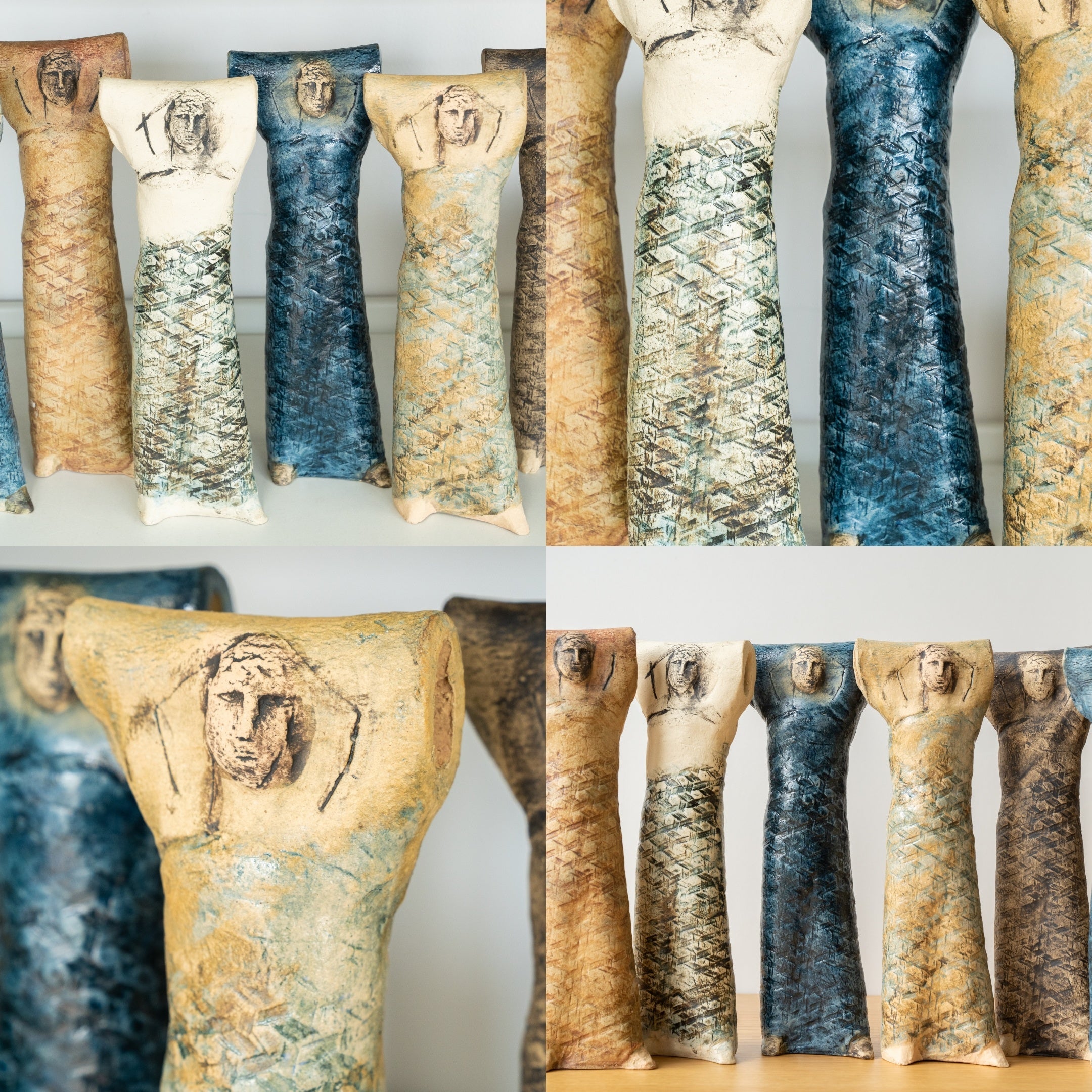 薄い粘土の板を使い、それを捏(こ)ねながら形にしていくリサの典型的な手法でつくられています。顔は金属酸化物の溶剤を使い、目や顔のような跡を残して拭き取る技法で絵付けされました。この作品は、女性の弱さ、そして緊張と力強さを表現したとのこと。手仕事ならではの個体差と、釉薬の色味の違いがどこまでも美しい作品です。繊細さと力強さ、緊張と弛緩もすべて一つの作品から感じとれます。