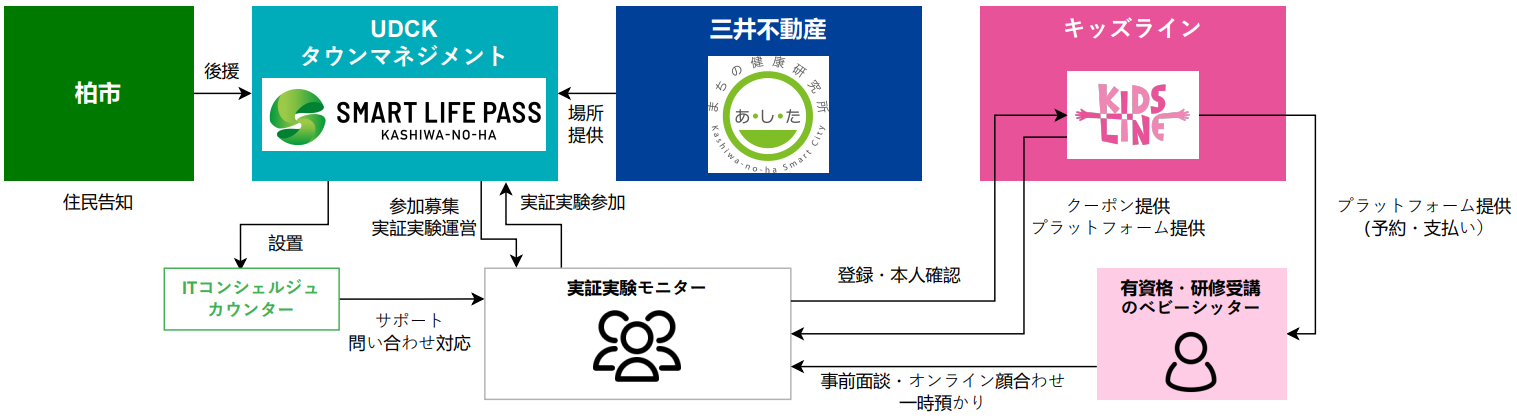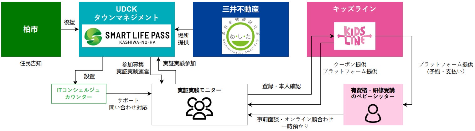 柏市は本実証実験を後援し、柏市の子育て情報の一環として実証実験の開催を市民に告知します。キッズラインはベビーシッターとのマッチングプラットフォームの提供、および、実証実験参加者向けのクーポンを提供します。三井不動産はまちの健康研究所「あ・し・た」のスペースを提供します。UDCKタウンマネジメントは「スマートライフパス柏の葉」を通じて実証実験の参加者募集、アンケート、座談会など実証実験の運営をします。