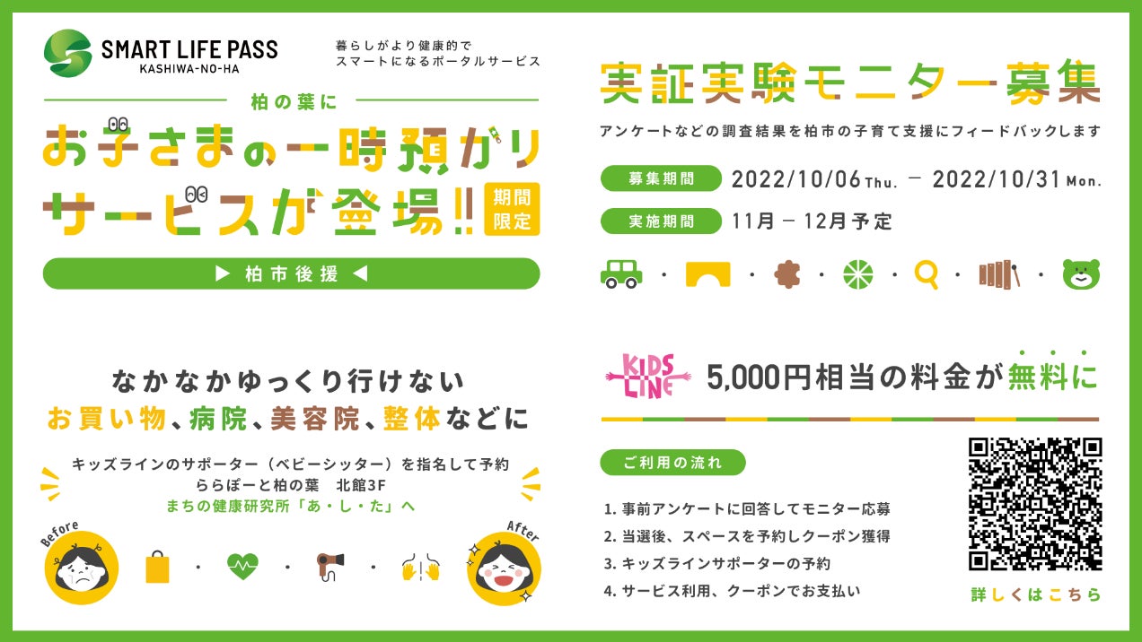 株式会社キッズライン(代表取締役 経沢香保子、以下「キッズライン」)、三井不動産株式会社(代表取締役社長 菰田正信、以下「三井不動産」)、一般社団法人UDCKタウンマネジメント(以下「UDCKタウンマネジメント」)は、柏市の子育て支援ニーズを把握するため、柏市と協力しながら一時預かりサービスを無料利用できる実証実験を11月8日(火)より開始します。また、参加者の募集を10月6日(木)より開始します。