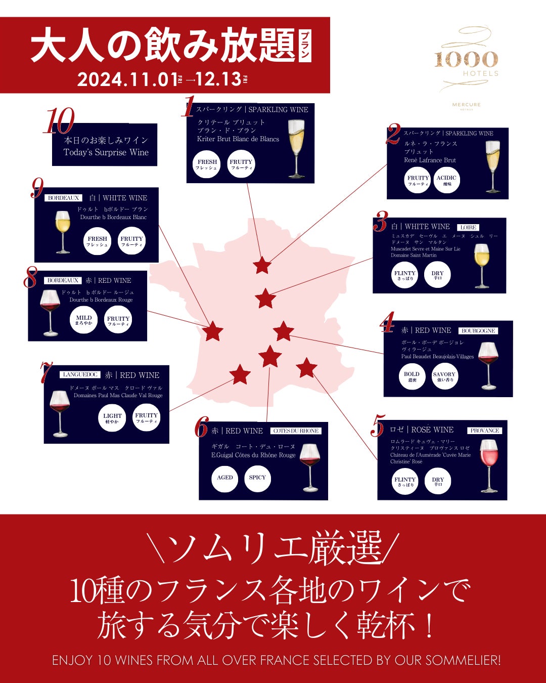「ソムリエ厳選!10種の赤・白ワイン&スパークリングで旅するフランス」