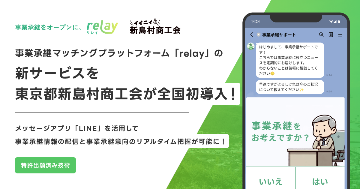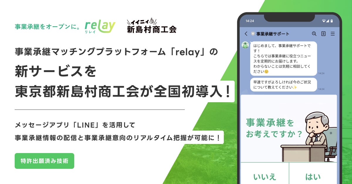 【特許出願済技術】事業承継マッチングプラットフォーム「relay(リレイ)」の新サービスを東京都新島村商工会が全国初導入!LINEを利用し、事業承継意向のリアルタイム把握が可能に