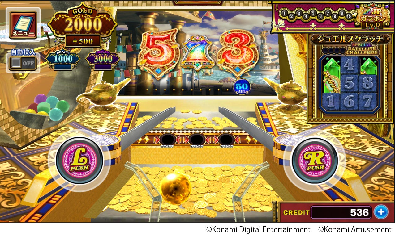 コナステ版は、フィールド内にあるポケット(穴)にボールを落とすことで始まる「サテライトチャレンジ」や「ジャックポットチャンス」に加え、青のボールがポケットに入るまで抽選が継続される「JPガラポン」などのアーケード版でお楽しみいただいているゲーム体験を再現しています。