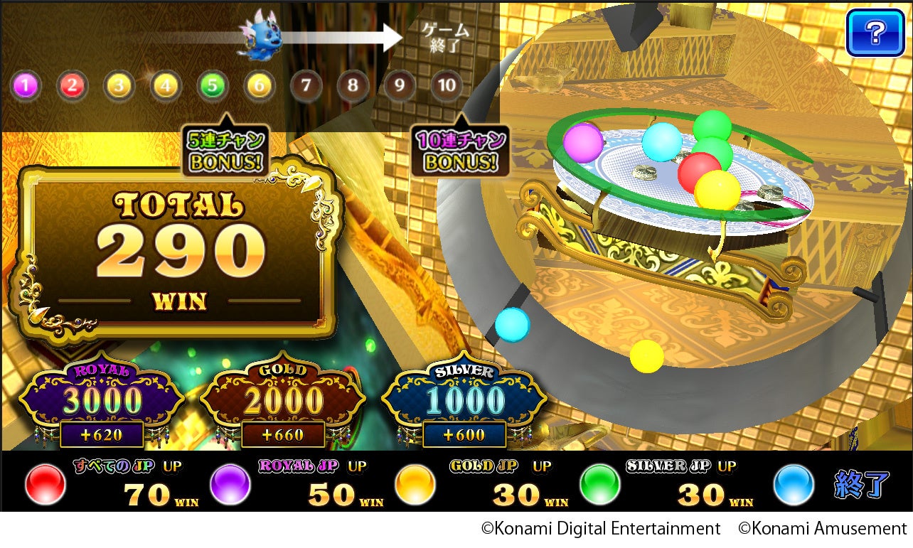 ボールの色に合わせて、対応した3種のJACKPOT(ROYAL JACKPOT、GOLD JACKPOT、SILVER JACKPOT)の上乗せ配当が上がります。