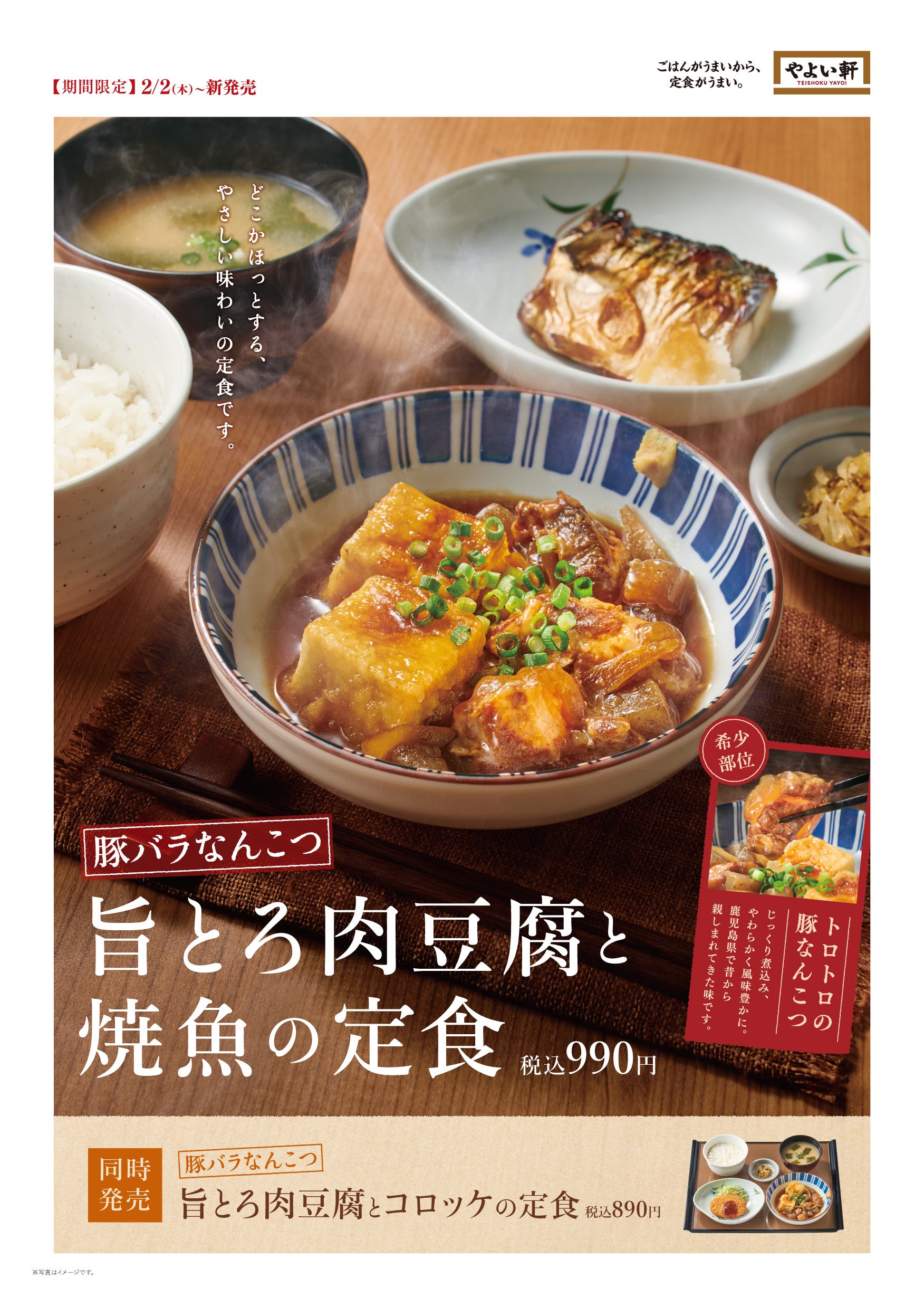 「やよい軒」寒い季節の身体に染みる、煮込み定食が登場!トロトロの豚バラなんこつ煮込みと揚げ豆腐の相性抜群『~豚バラなんこつ~旨とろ肉豆腐と焼魚の定食』『~豚バラなんこつ~旨とろ肉豆腐とコロッケの定食』