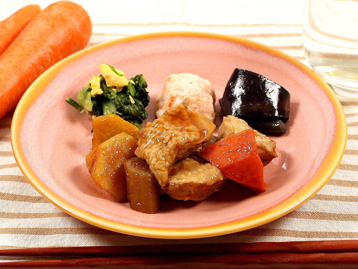 やわらかく蒸しあげた鶏もも肉と、ゴボウ、サツマイモ、人参にしょうゆベースの甘辛だれをかけました。具材とタレをよく絡めてお召し上がりください。