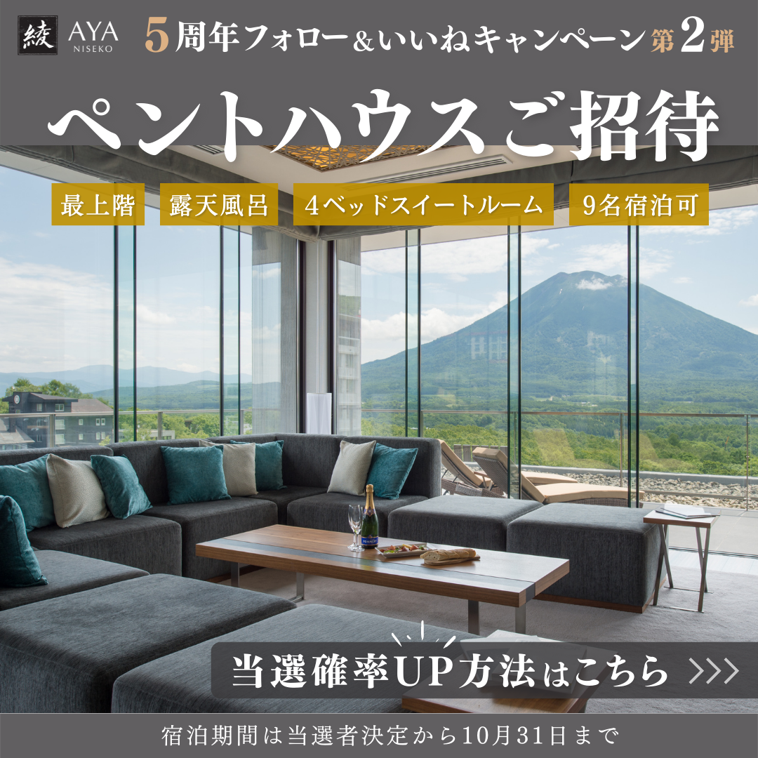 ホテル型コンドミニアムの綾ニセコ(北海道倶知安町、総支配人:今井 正三)は、ラグジュアリースイートルーム「ペントハウス」にご招待する Instagramキャンペーンを 6 月 17 日(金)より開始いたします。