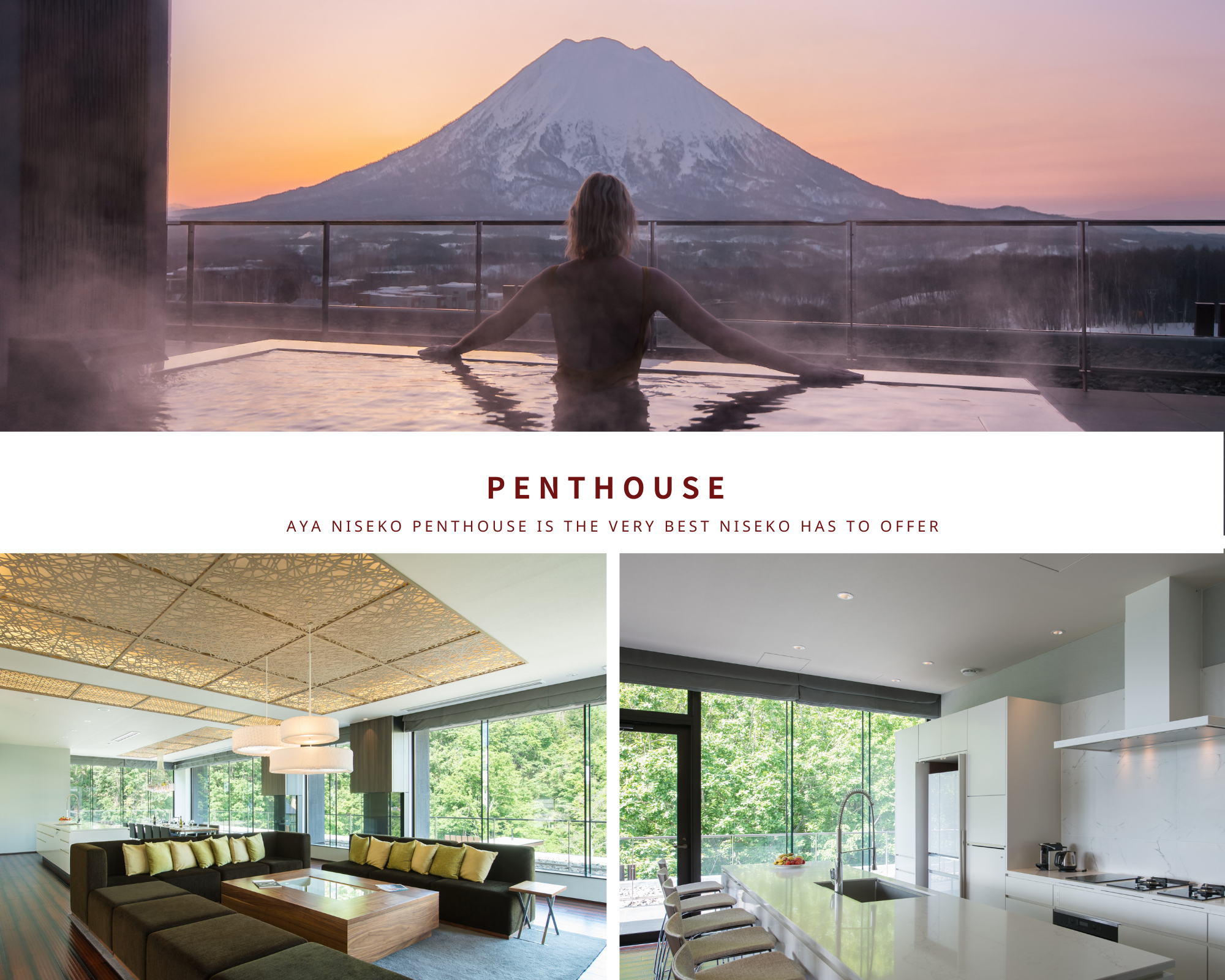 AYA ニセコでは開業 5 周年を迎えたことを記念し、ラグジュアリースイートルーム「ペントハウス」の宿泊ご招待券が当たる Instagram キャンペーンを実施します。当館で最も広いお部屋「ペントハウス」は、最上階に位置し、100%かけ流し天然温泉露天風呂を備えるラグジュアリースイートルームです。天地 3 メートルのガラス窓が北海道の開放感を演出。広さは、277 ㎡〜373 ㎡で、5つのベッドルームやリビングダイニング、アイランドキッチンを備え、ゆったりとした間取りが特徴です。ベッドルームには、各々にバスルームがついており、最大 9 名までご宿泊いただけます。