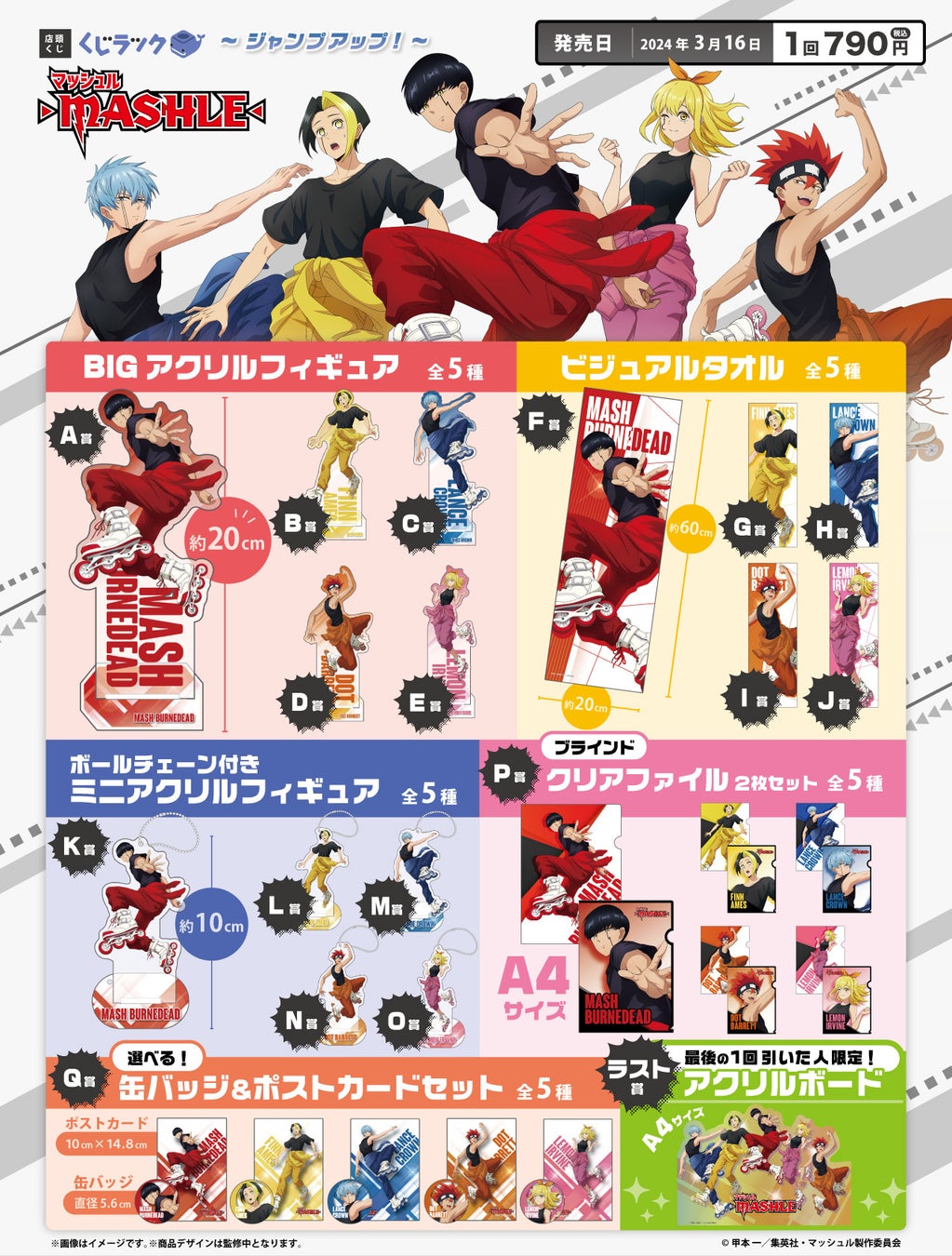 カルチュア・エンタテインメント株式会社(以下、CE)は、TVアニメ『マッシュル-MASHLE-』とコラボレーションした、はずれなしのリアルくじ「くじラック」を、3月16日(土)より全国のTSUTAYA、ホビーショップ、書店、アミューズメント施設等で発売いたします。賞品は「ジャンプアップ!」をイメージした描き下ろしイラストを使用したBIGアクリルフィギュアや、ビジュアルタオルなど、全5アイテムとなっております。さらに最後のくじ購入者にはラスト賞として、A4サイズのアクリルボードをご用意しております。