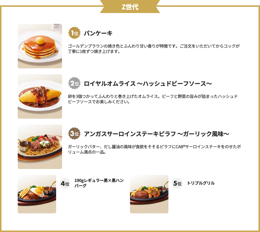 また、Z世代は2位に濃厚なハッシュドビーフソースが特徴の「ロイヤルオムライス~ハッシュドビーフソース~」、5位に3種のお肉を一度に楽しめる「トリプルグリル」とボリューム満点のメニューがランクインしました。