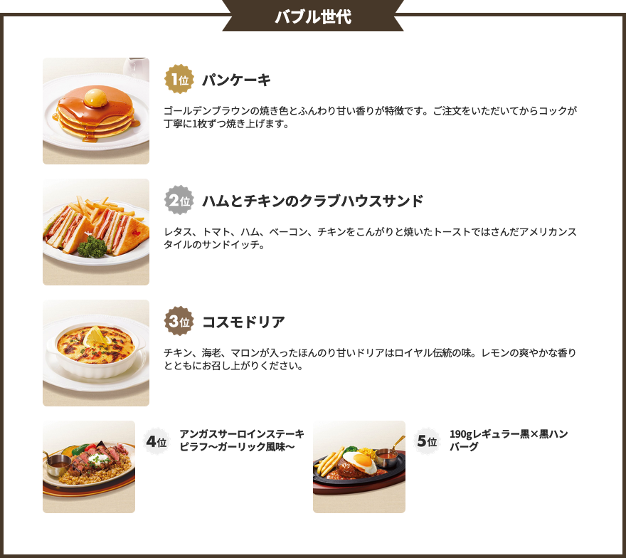 ■「Z世代vs.バブル世代!!ロイヤルホストの人気メニューランキングTOP5」