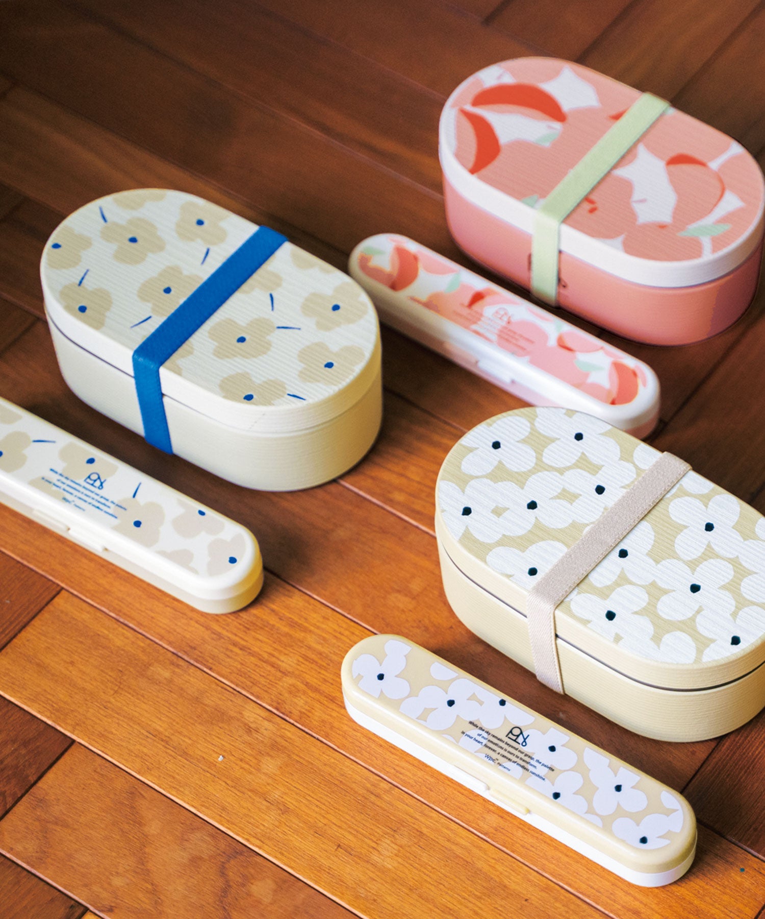 周りの目を引くデザインが印象的な「ランチボックス」は、1段なのに具材がたっぷり詰められるから、毎日使いにも◎。シール蓋で部品が少なく、お手入れしやすいのも嬉しいポイント。簡易保冷生地を使用した「ランチ巾着」やお箸、スプーン、フォークをコンパクトに収納できる「カトラリーセット」と柄を揃えて使うことで統一感が生まれ、思わずSNSに載せたくなる可愛らしさに。