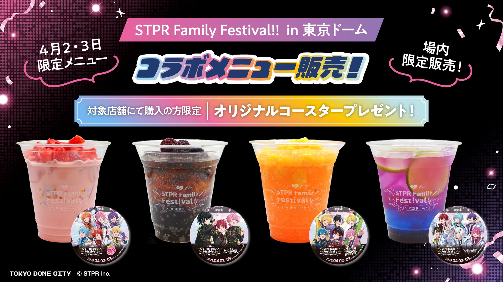 ②東京ドームシティの対象店舗にて『STPR Familyのグッズ』or『公演チケットをご提示』&1会計につき1,000円以上のご購入で、『STPR Family Festival!! in 東京ドーム オリジナルステッカー』をプレゼント!