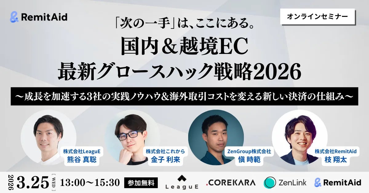 株式会社LeaguEは株式会社これから、ZenGroup株式会社、株式会社RemitAidと共同で、国内ECおよび越境ECの成長戦略をテーマにした無料オンラインセミナー『国内&越境EC 最新グロースハック戦略〜2026年の成長を加速する4社の実践ノウハウ〜』を2026年3月25日(水)13時から開催いたします。