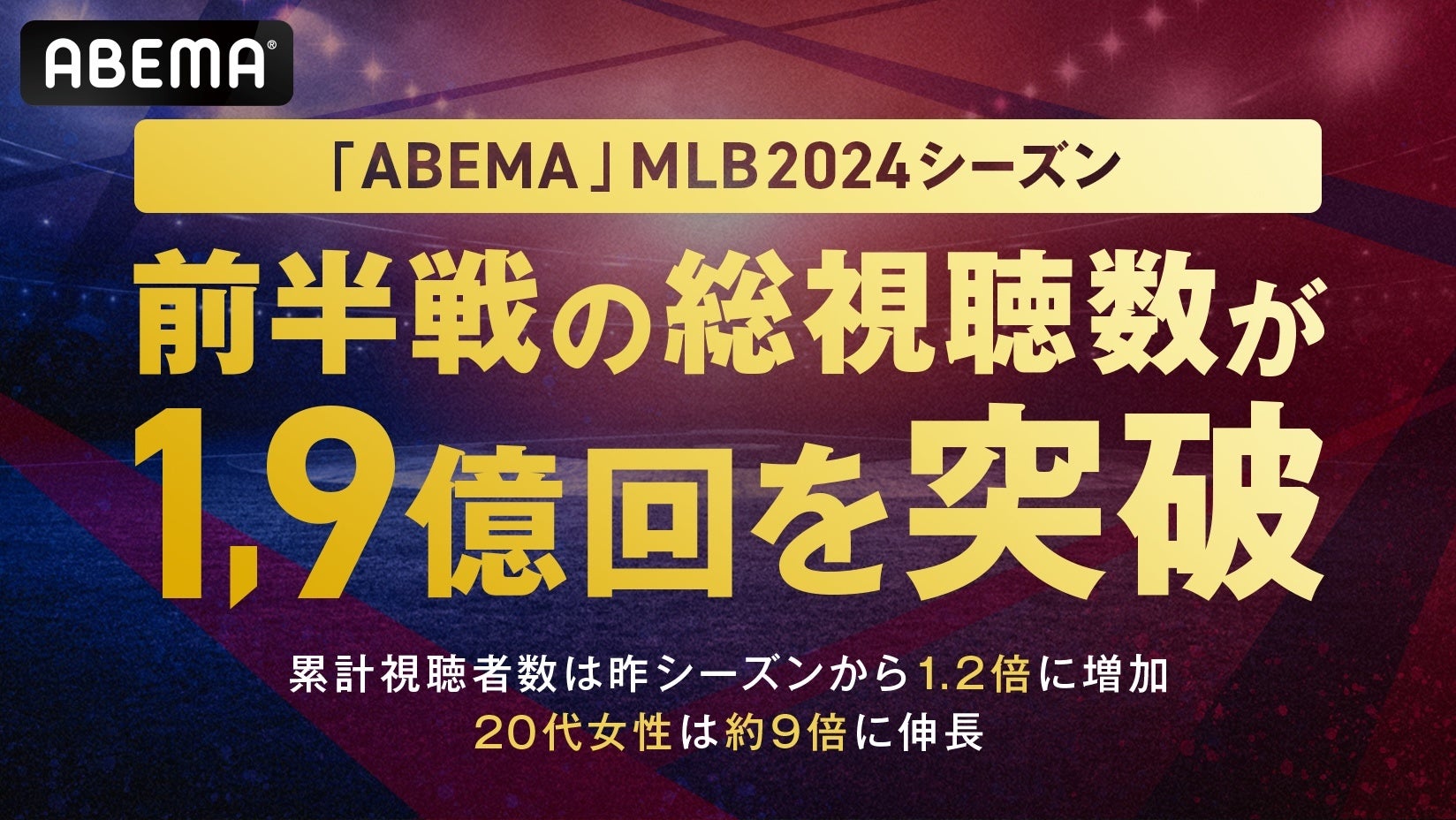 新しい未来のテレビ「ABEMA(アベマ)」は、2024年3月20日(水)のロサンゼルス・ドジャース開幕戦から生中継した「メジャーリーグベースボール」(以下、MLB)の2024シーズンにおいて、7月15日の前半戦終了時点で、総視聴数が1.9億回を突破しました。さらに、累計視聴者数は昨シーズンから1.2倍に増加し、特に20代女性の視聴者が約9倍に伸長したことをお知らせいたします。(※)
